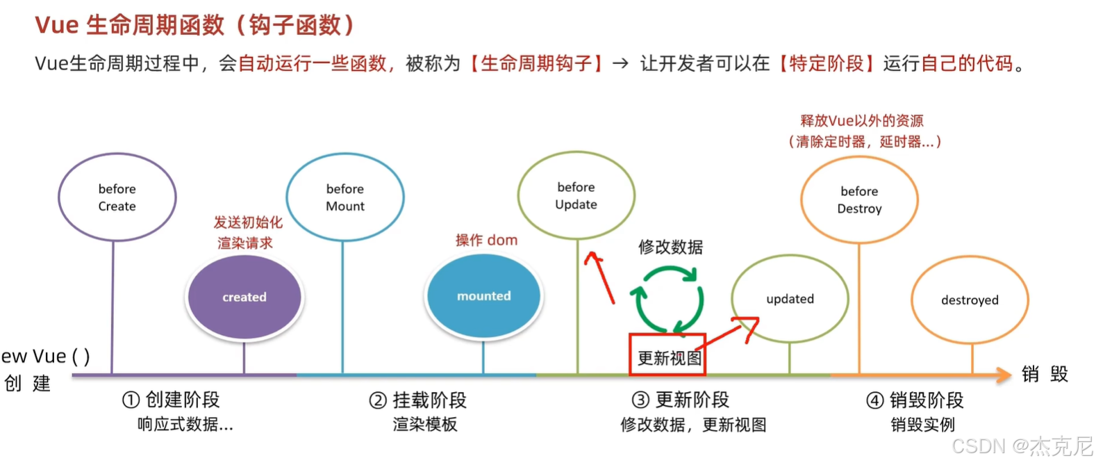 Vue 生命周期可分为创建、挂载、更新、销毁四个大阶段,每个阶段对应一组钩子函数: