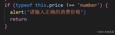 typeof this.price 的作用是检测 this.price 这个变量的数据类型,然后与字符串 'number' 比较。