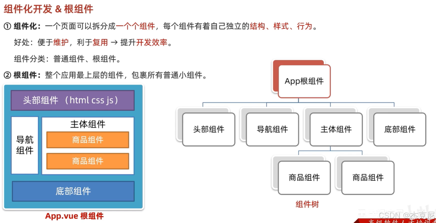 组件化是 Vue 实现代码复用、逻辑解耦的关键机制。一个 Vue 应用由若干个组件嵌套、组合而成,从 “根组件” 到 “业务组件”,构成完整的页面。