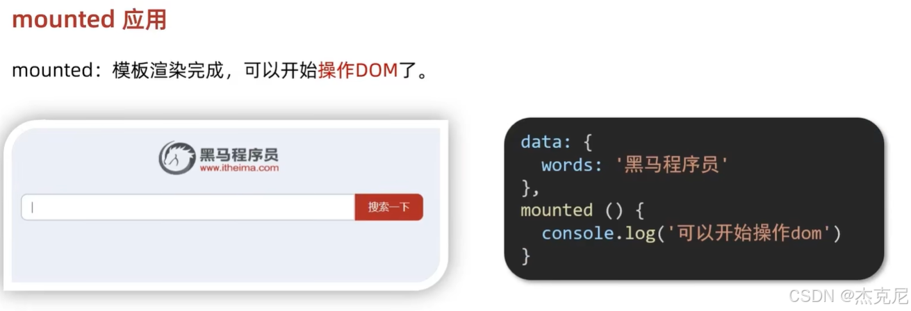 mounted:DOM 已挂载到页面,可在此操作真实 DOM(如初始化第三方插件、获取 DOM 尺寸)。