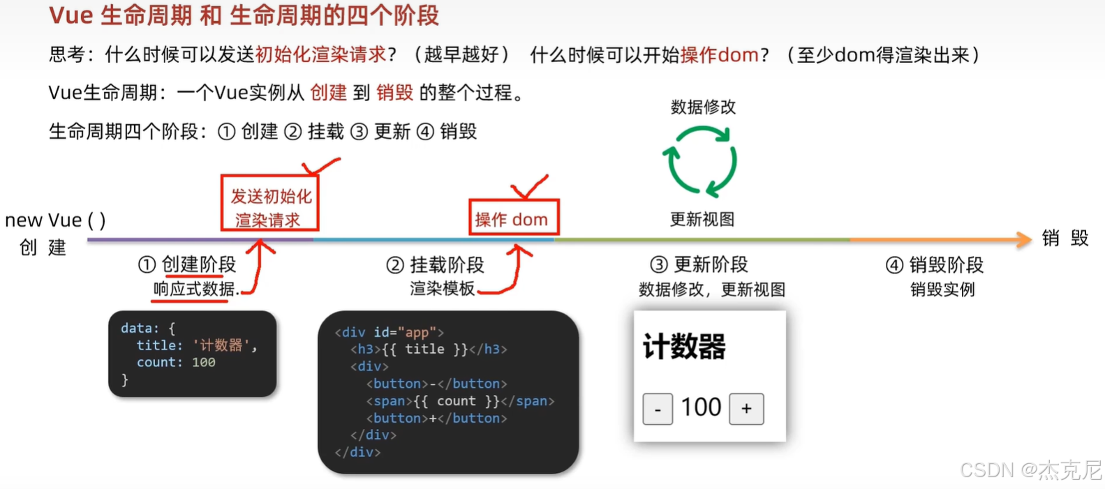 Vue 实例从创建到销毁的整个过程,被称为生命周期。理解生命周期,能让我们在合适的时机执行代码(如初始化数据、发起请求、操作 DOM 等),是掌握 Vue 组件逻辑的基础。