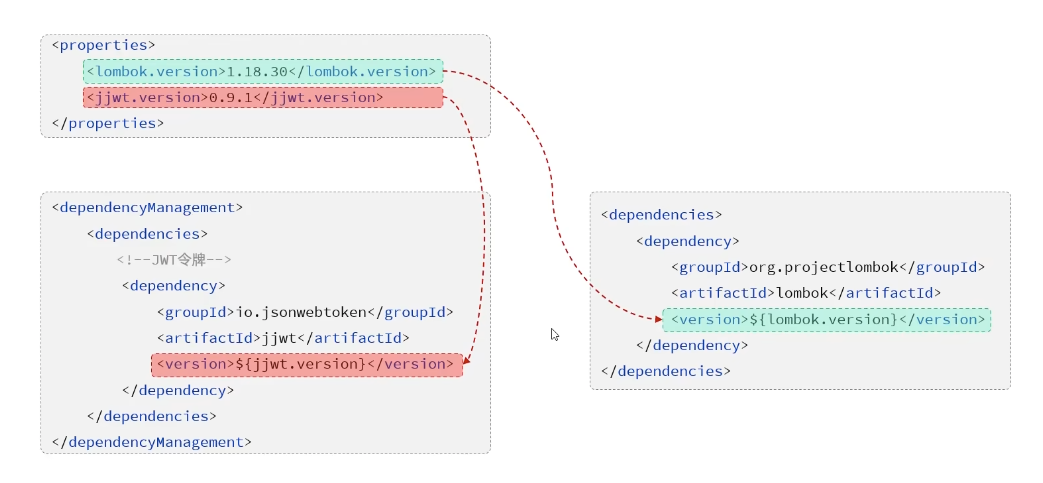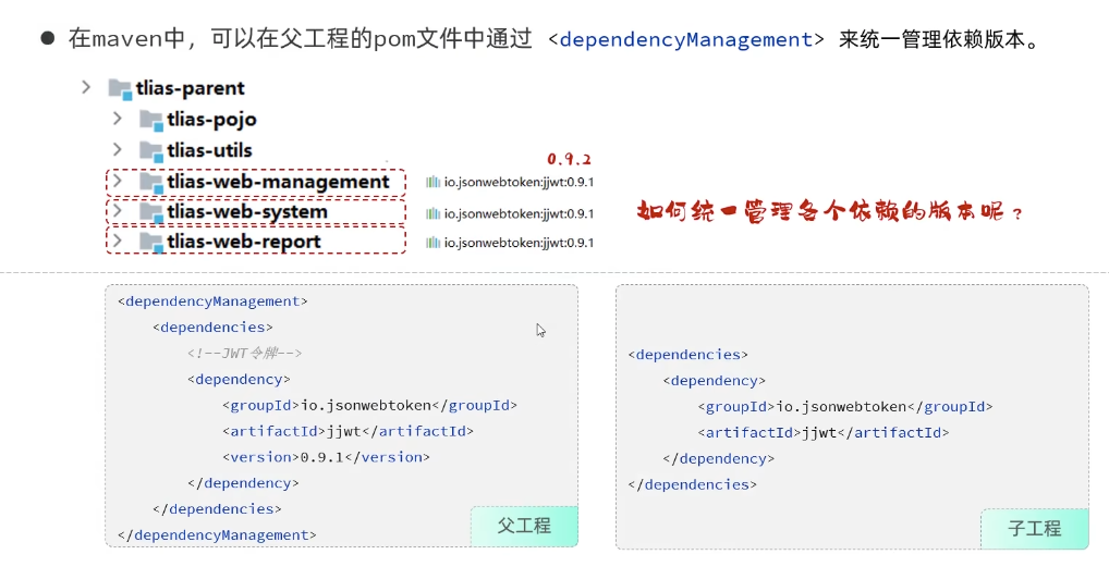 <project xmlns="http://maven.apache.org/POM/4.0.0"xmlns:xsi="http://www.w3.org/2001/XMLSchema-instance"xsi:schemaLocation="http://maven.apache.org/POM/4.0.0 http://maven.apache.org/xsd/maven-4.0.0.xsd"><modelVersion>4.0.0</modelVersion><parent><groupId>org.springframework.boot</groupId><artifactId>spring-boot-starter-parent</artifactId><version>3.5.6</version><!--父工程pom.xml的相对位置--><relativePath/></parent><groupId>cc.feitwnd</groupId><artifactId>tlias-parent</artifactId><version>1.0-SNAPSHOT</version><packaging>pom</packaging><properties><maven.compiler.source>21</maven.compiler.source><maven.compiler.target>21</maven.compiler.target><project.build.sourceEncoding>UTF-8</project.build.sourceEncoding><!--自定义属性--><lombok.version>1.18.40</lombok.version><spring.boot.starter.version>3.5.7</spring.boot.starter.version><aliyun.sdk.version>3.17.4</aliyun.sdk.version><jaxb.api.version>2.3.1</jaxb.api.version><activation.version>1.1.1</activation.version><jaxb.runtime.version>2.3.3</jaxb.runtime.version><jjwt.version>0.9.1</jjwt.version></properties><dependencies><dependency><groupId>org.projectlombok</groupId><artifactId>lombok</artifactId><version>${lombok.version}</version></dependency><dependency><groupId>org.springframework.boot</groupId><artifactId>spring-boot-starter</artifactId><version>${spring.boot.starter.version}</version></dependency></dependencies><dependencyManagement><dependencies><!-- 阿里云OSS --><dependency><groupId>com.aliyun.oss</groupId><artifactId>aliyun-sdk-oss</artifactId><version>${aliyun.sdk.version}</version></dependency><dependency><groupId>javax.xml.bind</groupId><artifactId>jaxb-api</artifactId><version>${jaxb.api.version}</version></dependency><dependency><groupId>javax.activation</groupId><artifactId>activation</artifactId><version>${activation.version}</version></dependency><!-- no more than 2.3.3--><dependency><groupId>org.glassfish.jaxb</groupId><artifactId>jaxb-runtime</artifactId><version>${jaxb.runtime.version}</version></dependency><!-- JWT --><dependency><groupId>io.jsonwebtoken</groupId><artifactId>jjwt</artifactId><version>${jjwt.version}</version></dependency></dependencies></dependencyManagement></project>聚合