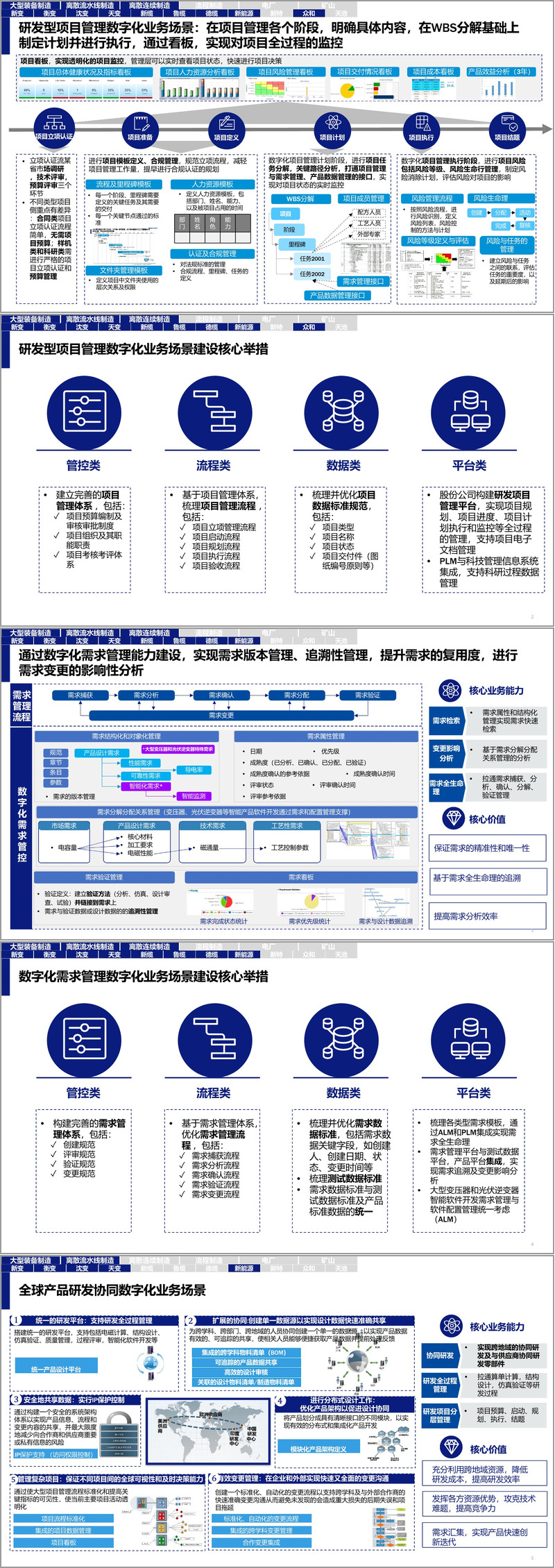 在研发数字化方面,方案指出当前三维建模应用水平低、参数化与模块化设计不足、仿真验证能力不全面等问题。通过对标发现,西门子与ABB已实现全三维设计、模块化重用与数字孪生应用,显著提升了研发效率与产品质量。为此,规划提出统一设计工具与标准、构建三维模型库与仿真平台、加强研发协同与知识沉淀等核心举措,逐步实现从“面向图纸”到“面向功能”的研发模式转型。