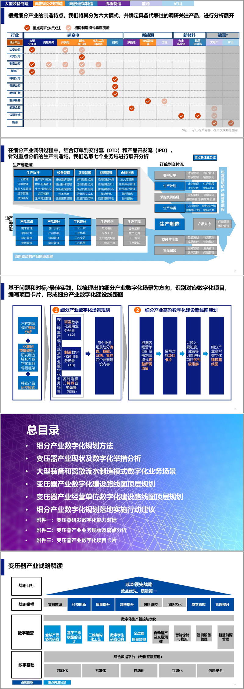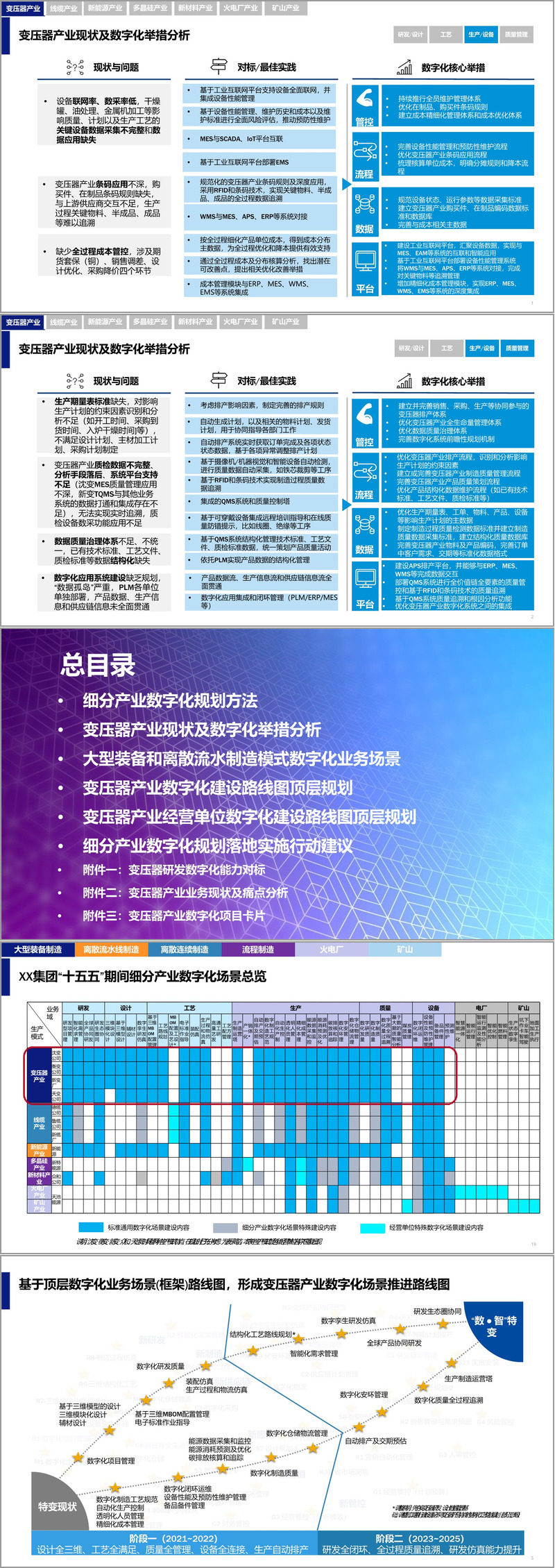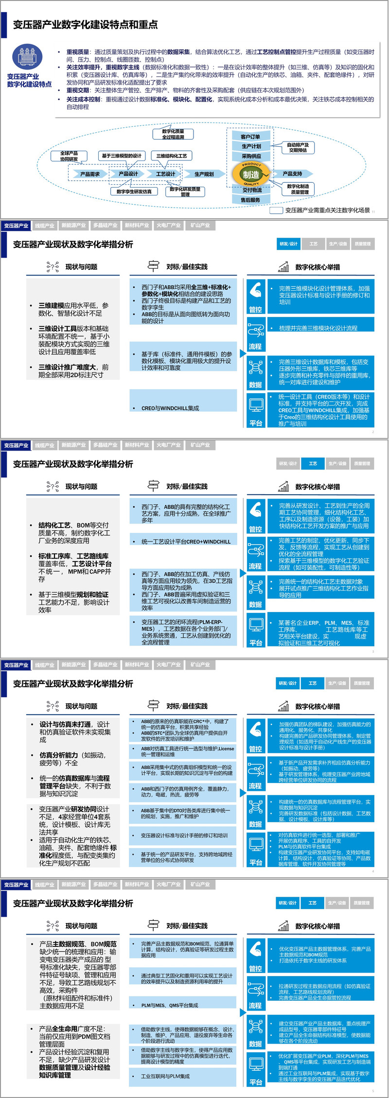 规划首先明确了数字化转型的总体框架与方法论。通过高层访谈、车间踏勘、设备调研等方式,集团全面梳理了业务现状与痛点,结合埃森哲的数字化蓝图规划方法论,从现状分析、蓝图规划到实施路线图,形成了系统化的推进策略。特别是在细分产业数字化规划中,聚焦变压器产业,深入分析了其研发、工艺、生产、质量、设备等核心环节的现状问题,并与西门子、ABB等国际领先企业进行对标,找出差距并提炼出适合自身的数字化举措。