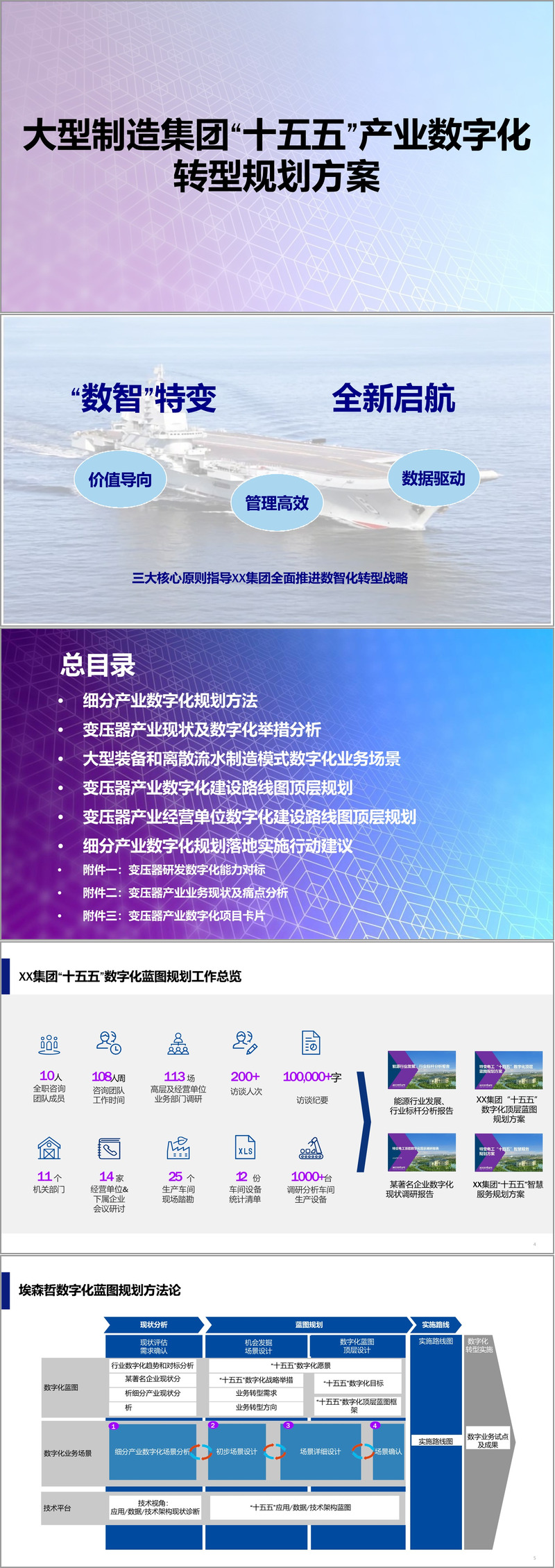 本规划方案围绕大型制造集团在“十五五”期间的产业数字化转型展开,系统性地提出了以“数智特变,全新启航”为愿景的转型蓝图。方案基于价值导向、数据驱动与管理高效三大核心原则,通过深入调研与分析,制定了涵盖变压器产业、大型装备制造、离散流水制造等多种生产模式的数字化转型路径。