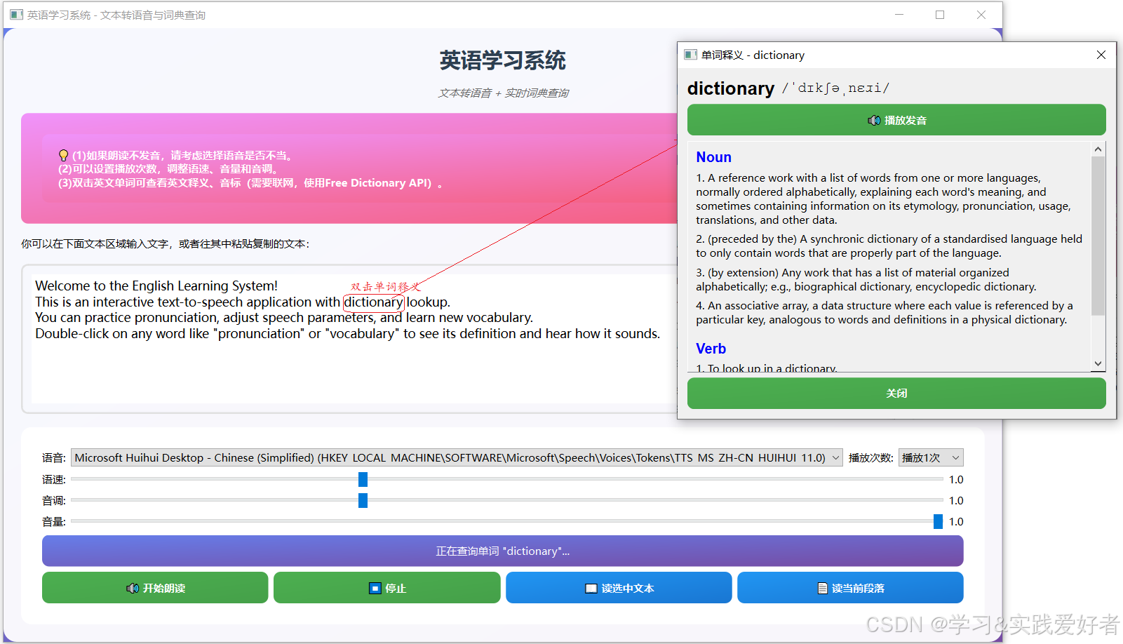 import pyttsx3class DictionaryLookupThread(QThread):result_ready = pyqtSignal(str, dict)error_occurred = pyqtSignal(str)def __init__(self, word):super().__init__()self.word = worddef run(self):try:response = requests.get(f"https://api.dictionaryapi.dev/api/v2/entries/en/{self.word}")if response.status_code == 200:data = response.json()self.result_ready.emit(self.word, data[0])else:self.error_occurred.emit("未找到该单词的释义")except Exception as e:self.error_occurred.emit(f"查询失败: {str(e)}")class WordDefinitionDialog(QDialog):def __init__(self, word, data, parent=None):super().__init__(parent)self.word = wordself.data = dataself.audio_url = None# 创建媒体播放器self.media_player = QMediaPlayer()self.audio_output = QAudioOutput()self.media_player.setAudioOutput(self.audio_output)self.init_ui()def init_ui(self):self.setWindowTitle(f"单词释义 - {self.word}")self.setGeometry(100, 100, 500, 400)layout = QVBoxLayout()# 单词标题title_layout = QHBoxLayout()word_label = QLabel(self.word)word_label.setFont(QFont("Arial", 16, QFont.Weight.Bold))title_layout.addWidget(word_label)# 音标if self.data.get('phonetics') and self.data['phonetics'][0].get('text'):phonetic = self.data['phonetics'][0]['text']phonetic_label = QLabel(phonetic)phonetic_label.setFont(QFont("Courier", 12))title_layout.addWidget(phonetic_label)title_layout.addStretch()layout.addLayout(title_layout)# 发音按钮for phonetic in self.data.get('phonetics', []):if phonetic.get('audio'):self.audio_url = phonetic['audio']breakif self.audio_url:audio_btn = QPushButton("🔊 播放发音")audio_btn.clicked.connect(self.play_audio)layout.addWidget(audio_btn)# 释义内容scroll_area = QScrollArea()content_widget = QWidget()content_layout = QVBoxLayout(content_widget)if self.data.get('meanings'):for meaning in self.data['meanings']:part_of_speech = meaning.get('partOfSpeech', '')pos_label = QLabel(part_of_speech.capitalize())pos_label.setFont(QFont("Arial", 12, QFont.Weight.Bold))pos_label.setStyleSheet("color: blue;")content_layout.addWidget(pos_label)for i, definition in enumerate(meaning.get('definitions', [])):def_text = f"{i+1}. {definition.get('definition', '')}"def_label = QLabel(def_text)def_label.setWordWrap(True)content_layout.addWidget(def_label)if definition.get('example'):example_text = f" 示例: {definition['example']}"example_label = QLabel(example_text)example_label.setWordWrap(True)example_label.setStyleSheet("color: gray; font-style: italic;")content_layout.addWidget(example_label)content_layout.addSpacing(10)scroll_area.setWidget(content_widget)scroll_area.setWidgetResizable(True)layout.addWidget(scroll_area)# 关闭按钮close_btn = QPushButton("关闭")close_btn.clicked.connect(self.accept)layout.addWidget(close_btn)self.setLayout(layout)def play_audio(self):"""播放单词发音"""if self.audio_url:try:# 重置播放位置到开头self.media_player.setPosition(0)# 设置音频源(如果尚未设置)if self.media_player.source() != QUrl(self.audio_url):self.media_player.setSource(QUrl(self.audio_url))# 播放音频self.media_player.play()except Exception as e:QMessageBox.critical(self, "错误", f"播放音频失败: {str(e)}")class EnglishLearningSystem(QMainWindow):def __init__(self):super().__init__()self.init_ui()self.init_tts()# 播放控制self.is_playing = Falseself.play_count = 1self.current_play_count = 0self.current_word = ""def init_ui(self):self.setWindowTitle("英语学习系统 - 文本转语音与词典查询")self.setGeometry(100, 100, 900, 700)# 设置样式self.setStyleSheet("""QMainWindow {background: qlineargradient(x1: 0, y1: 0, x2: 1, y2: 1,stop: 0 #667eea, stop: 1 #764ba2);}QWidget#centralWidget {background: rgba(255, 255, 255, 0.95);border-radius: 15px;}QLabel#title {font-size: 24px;font-weight: bold;color: #2c3e50;}QLabel#subtitle {font-style: italic;color: #666;}QFrame#controls {background: white;border-radius: 12px;padding: 15px;}QTextEdit {border: 2px solid #e0e0e0;border-radius: 8px;padding: 10px;font-size: 14px;}QTextEdit:focus {border-color: #667eea;}QPushButton {background: qlineargradient(x1: 0, y1: 0, x2: 1, y2: 1,stop: 0 #4CAF50, stop: 1 #45a049);color: white;border: none;border-radius: 8px;padding: 10px 20px;font-weight: bold;}QPushButton:hover {background: qlineargradient(x1: 0, y1: 0, x2: 1, y2: 1,stop: 0 #45a049, stop: 1 #4CAF50);}QPushButton.special {background: qlineargradient(x1: 0, y1: 0, x2: 1, y2: 1,stop: 0 #2196F3, stop: 1 #1976D2);}QPushButton.special:hover {background: qlineargradient(x1: 0, y1: 0, x2: 1, y2: 1,stop: 0 #1976D2, stop: 1 #2196F3);}QLabel#status {background: qlineargradient(x1: 0, y1: 0, x2: 1, y2: 1,stop: 0 #667eea, stop: 1 #764ba2);color: white;border-radius: 8px;padding: 10px;text-align: center;}""")# 中央部件central_widget = QWidget()central_widget.setObjectName("centralWidget")self.setCentralWidget(central_widget)# 主布局layout = QVBoxLayout(central_widget)layout.setContentsMargins(20, 20, 20, 20)layout.setSpacing(15)# 标题title_label = QLabel("英语学习系统")title_label.setObjectName("title")title_label.setAlignment(Qt.AlignmentFlag.AlignCenter)layout.addWidget(title_label)subtitle_label = QLabel("文本转语音 + 实时词典查询")subtitle_label.setObjectName("subtitle")subtitle_label.setAlignment(Qt.AlignmentFlag.AlignCenter)layout.addWidget(subtitle_label)# 学习提示tip_frame = QFrame()tip_frame.setStyleSheet("""QFrame {background: qlineargradient(x1: 0, y1: 0, x2: 1, y2: 1,stop: 0 #f093fb, stop: 1 #f5576c);border-radius: 8px;padding: 15px;}QLabel {color: white;font-weight: bold;}""")tip_layout = QVBoxLayout(tip_frame)tip_text = QLabel("💡 (1)如果朗读不发音,请考虑选择语音是否不当。\n""(2)可以设置播放次数,调整语速、音量和音调。\n""(3)双击英文单词可查看英文释义、音标(需要联网,使用Free Dictionary API)。")tip_text.setWordWrap(True)tip_layout.addWidget(tip_text)layout.addWidget(tip_frame)# 文本区域text_label = QLabel("你可以在下面