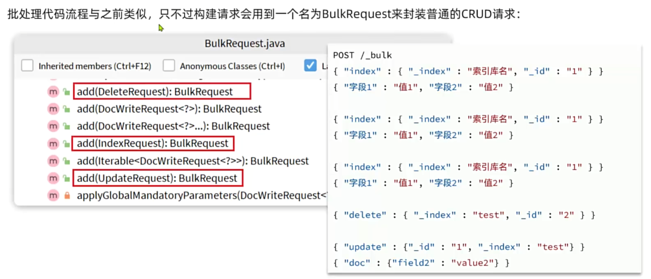 bulk操作就是将很多个Index、Delete、Update请求添加到BulkRequest中,然后统一执行。因此Bulk中添加了多个IndexRequest,就是批量新增功能了。示例: