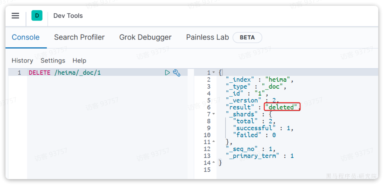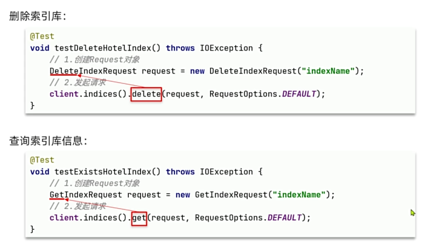 void testDeleteIndex() throws IOException {// 1.创建Request对象DeleteIndexRequest request = new DeleteIndexRequest("items");// 2.发送请求client.indices().delete(request, RequestOptions.DEFAULT);