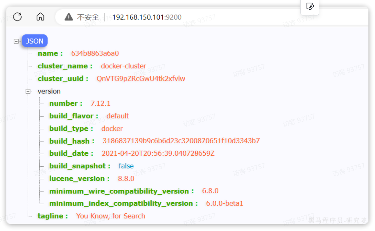注意,这里我们采用的是elasticsearch的7.12.1版本,由于8以上版本的JavaAPI变化很大,在企业中应用并不广泛,企业中应用较多的还是8以下的版本。安装完成后,访问9200端口,即可看到响应的Elasticsearch服务的基本信息:
