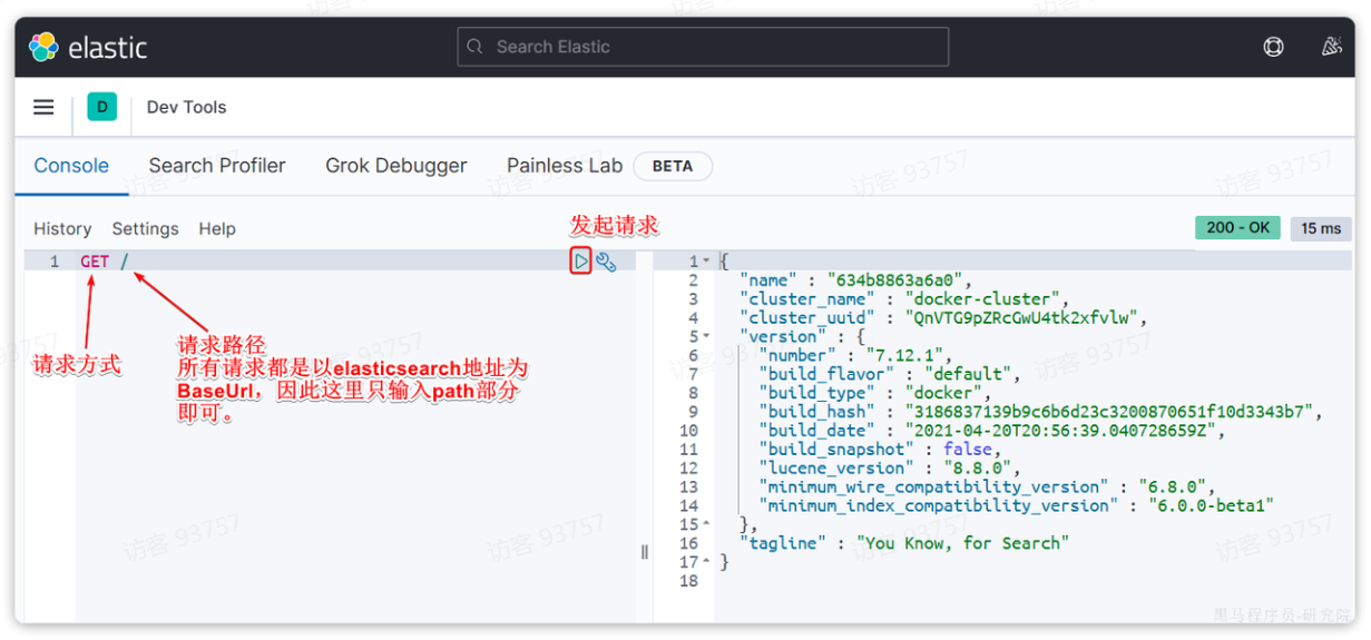 然后是Kibana,Elasticsearch对外提供的是Restful风格的API,任何操作都可以通过发送http请求来完成。不过http请求的方式、路径、还有请求参数的格式都有严格的规范。这些规范我们肯定记不住,因此我们要借助于Kibana这个服务。