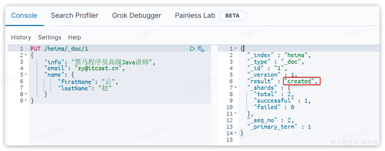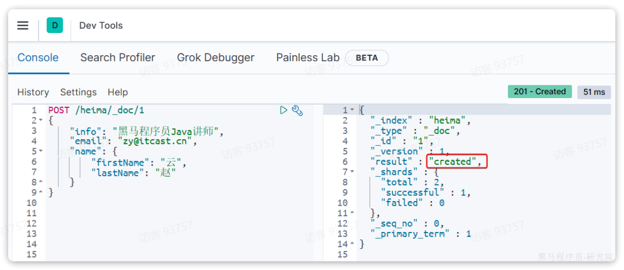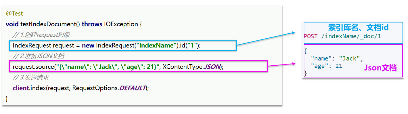 @Testvoid testIndexDoc() throws IOException {//0.准备文档数据Item item = itemService.getById(1178447L);ItemDoc itemDoc = BeanUtil.copyProperties(item, ItemDoc.class);//1.准备Request对象IndexRequest request = new IndexRequest("items").id(itemDoc.getId());//2.准备请求参数request.source(JSONUtil.toJsonStr(itemDoc), XContentType.JSON);//3.发送请求client.index(request, RequestOptions.DEFAULT);}