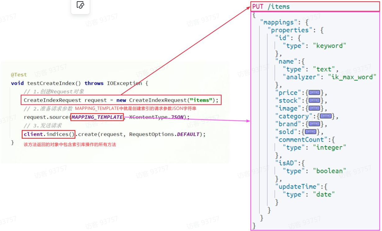 void testCreateIndex() throws IOException {// 1.创建Request对象CreateIndexRequest request = new CreateIndexRequest("items");// 2.准备请求参数request.source(MAPPING_TEMPLATE, XContentType.JSON);// 3.发送请求client.indices().create(request, RequestOptions.DEFAULT);