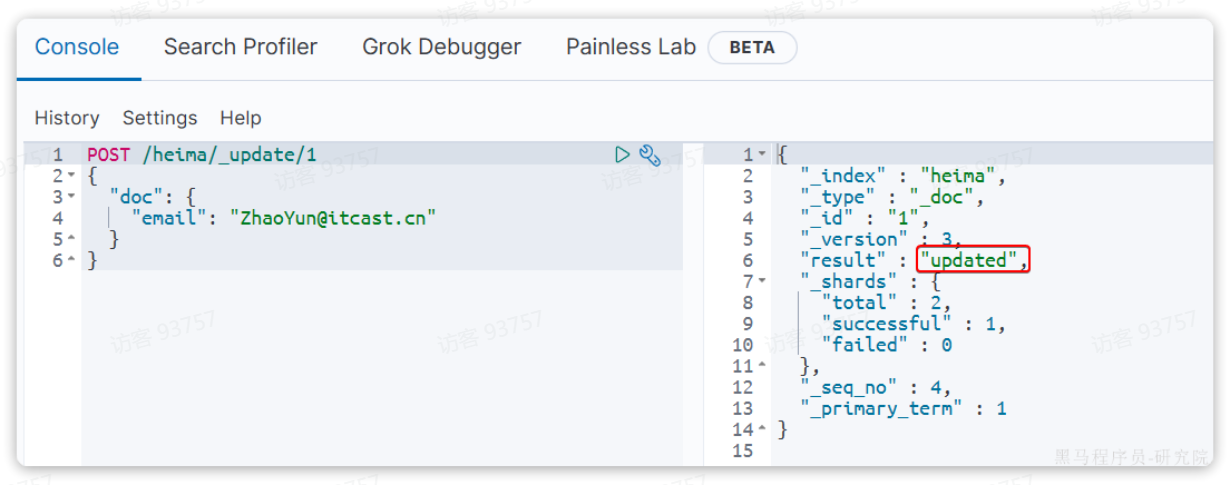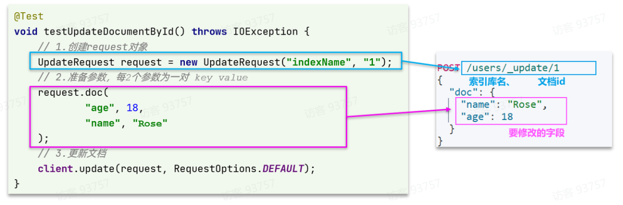 void testUpdateDocument() throws IOException {// 1.准备RequestUpdateRequest request = new UpdateRequest("items", "100002644680");// 2.准备请求参数request.doc("price", 58800,"commentCount", 1);// 3.发送请求client.update(request, RequestOptions.DEFAULT);