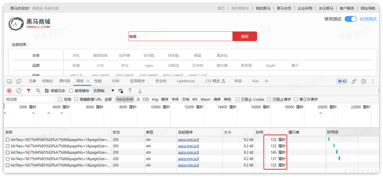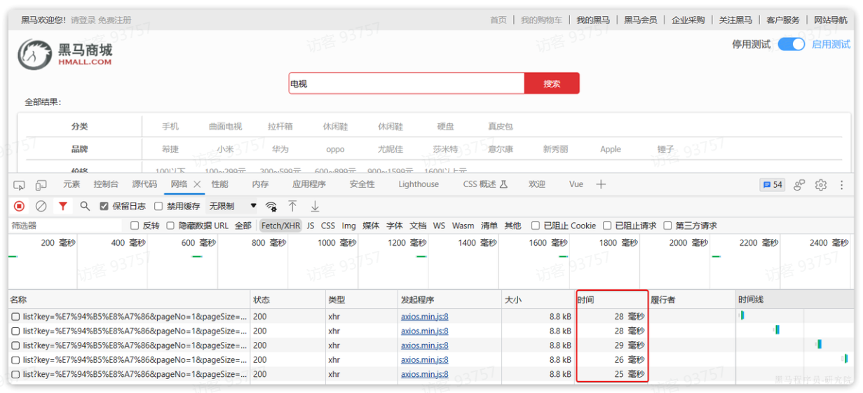 由于数据库模糊查询不走索引,在数据量较大的时候,查询性能很差。黑马商城的商品表中仅仅有不到9万条数据,基于数据库查询时,搜索接口的表现如图: