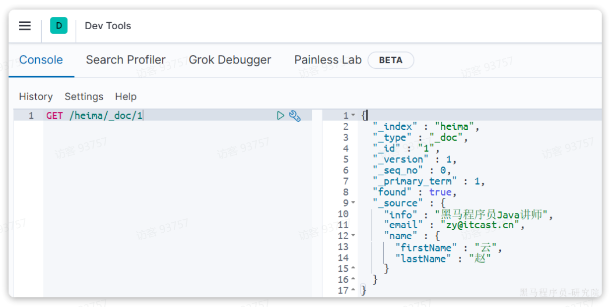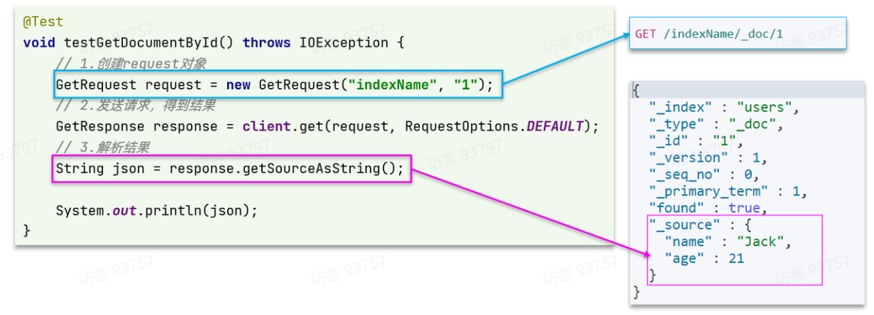 @Testvoid testGetDoc() throws IOException {GetRequest request = new GetRequest("items").id("1178447");GetResponse response = client.get(request, RequestOptions.DEFAULT);String json = response.getSourceAsString();ItemDoc itemDoc = JSONUtil.toBean(json, ItemDoc.class);System.out.println(itemDoc);}