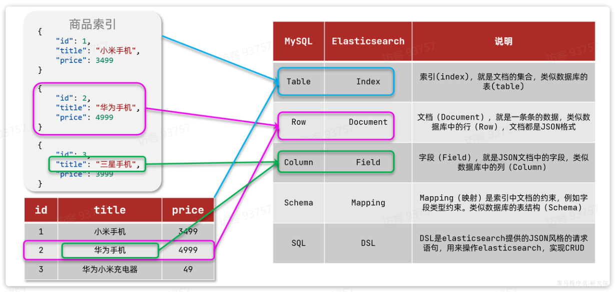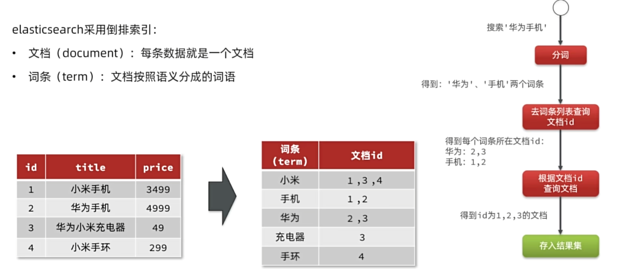- 对文档内容分词,对词条创建索引,并记录词条所在文档的id。查询时先根据词条查询到文档id,而后根据文档id查询文档