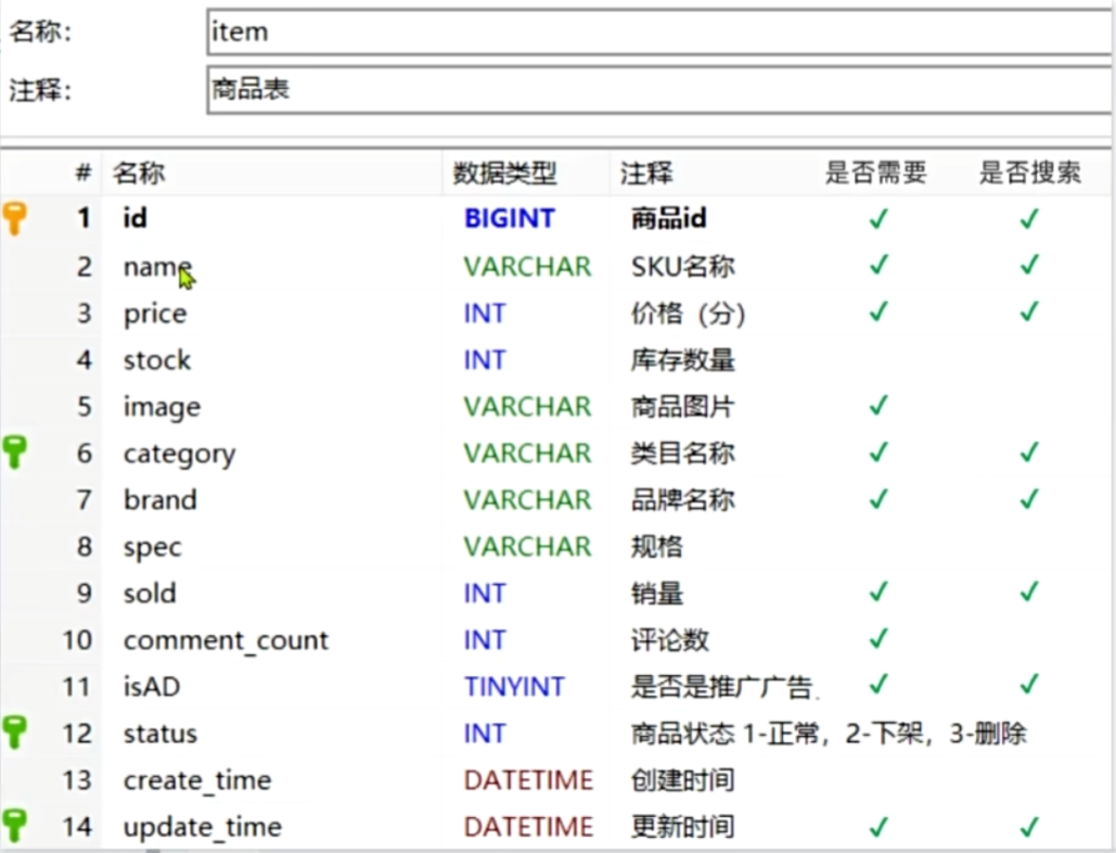 public class ItemDoc{@ApiModelProperty("商品id")private String id;@ApiModelProperty("商品名称")private String name;@ApiModelProperty("价格(分)")private Integer price;@ApiModelProperty("商品图片")private String image;@ApiModelProperty("类目名称")private String category;@ApiModelProperty("品牌名称")private String brand;@ApiModelProperty("销量")private Integer sold;@ApiModelProperty("评论数")private Integer commentCount;@ApiModelProperty("是否是推广广告,true/false")private Boolean isAD;@ApiModelProperty("更新时间")private LocalDateTime updateTime;