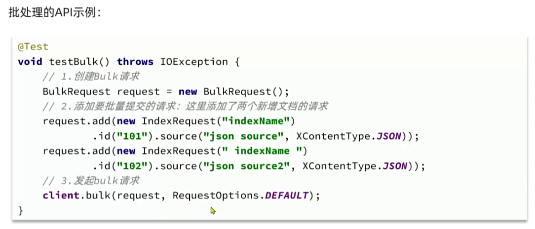 void testBulk() throws IOException {// 1.创建RequestBulkRequest request = new BulkRequest();// 2.准备请求参数request.add(new IndexRequest("items").id("1").source("json doc1", XContentType.JSON));request.add(new IndexRequest("items").id("2").source("json doc2", XContentType.JSON));// 3.发送请求client.bulk(request, RequestOptions.DEFAULT);