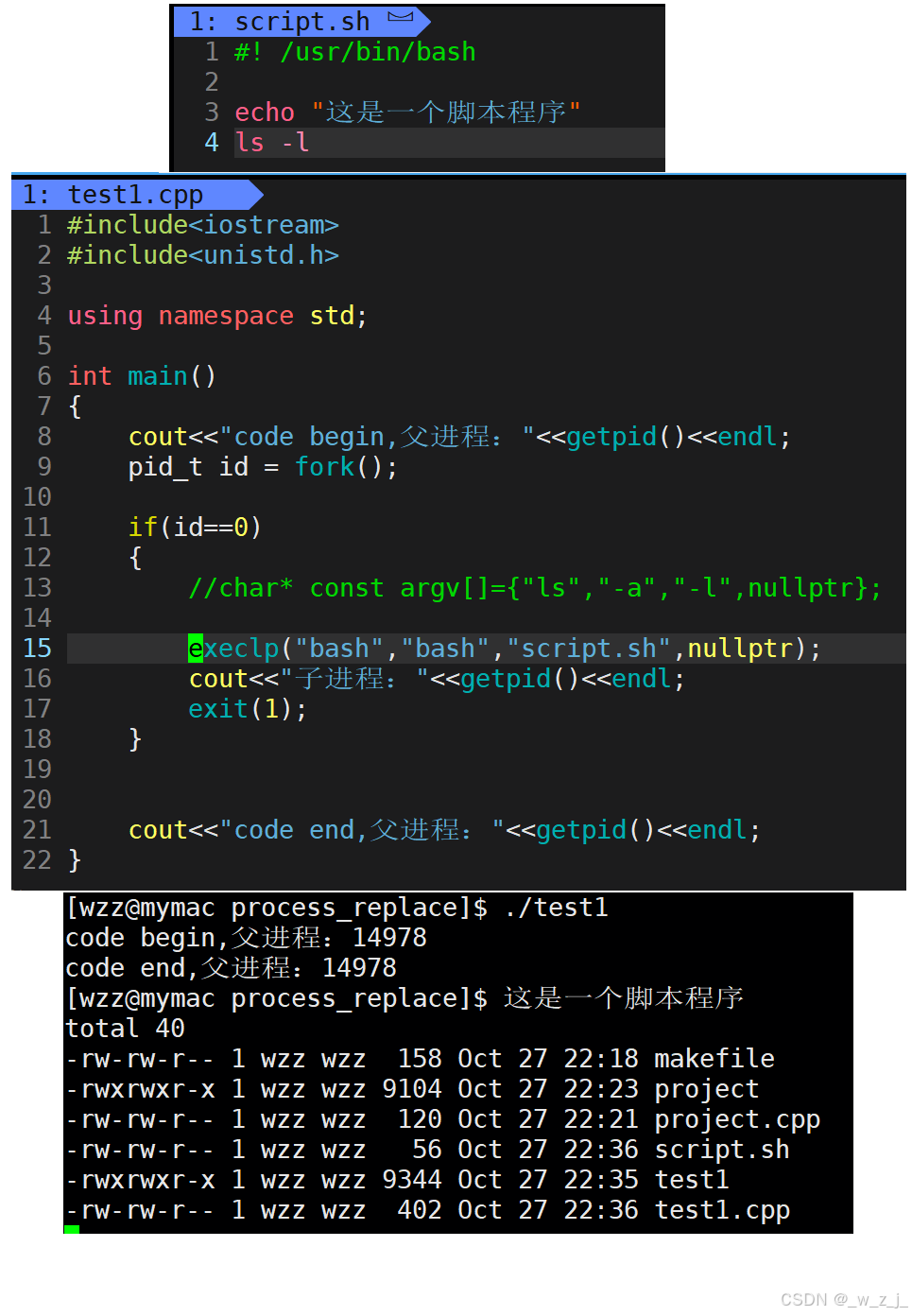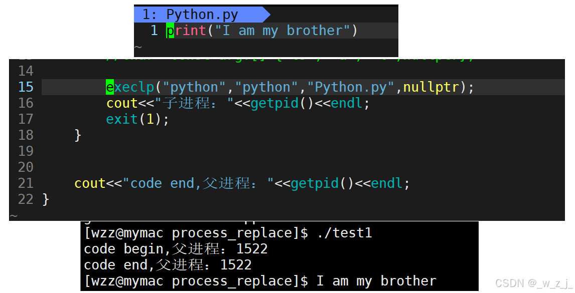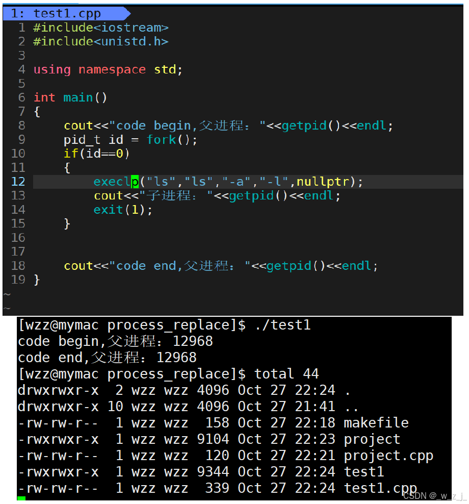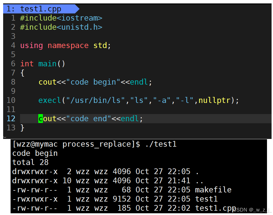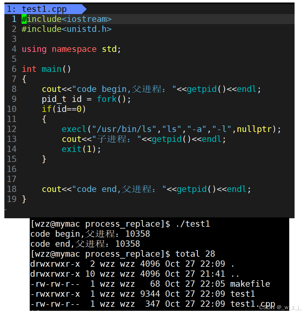 举一个例子,可以看到在该进程中,并没有打印code end,而是打印code begin后执行了ls程序。这就是程序替换