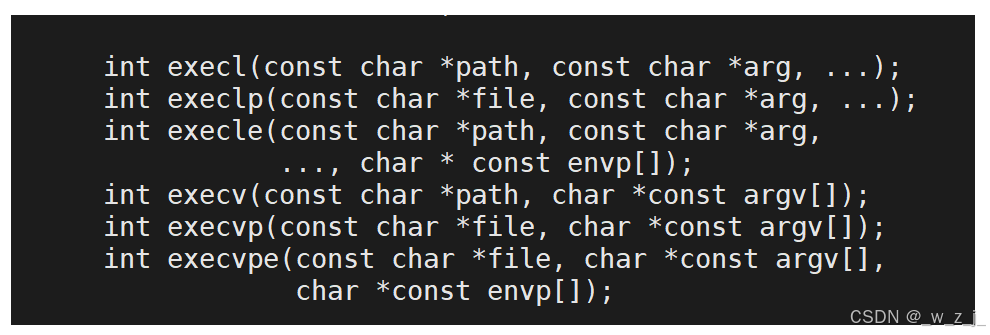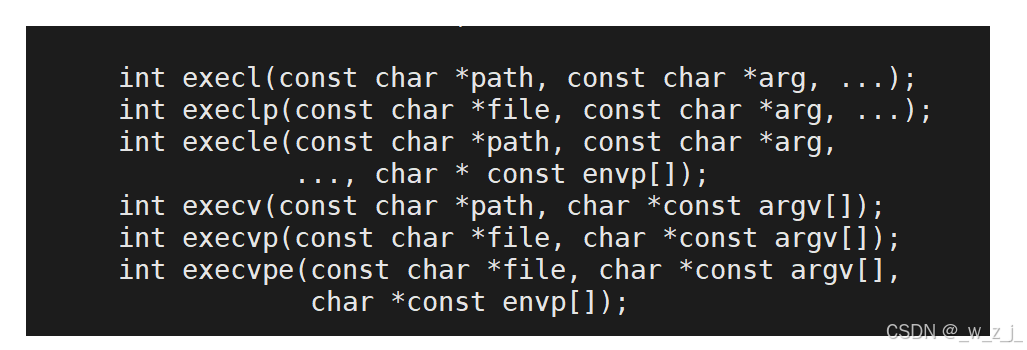 l(list) 表示参数采用列表 v(vector) 参数用数组 p(path) 有p自动搜索环境变量PATH e(env) 表示自己维护环境变量 只有execve是真正的系统调用,其它五个函数最终都调用 execve。