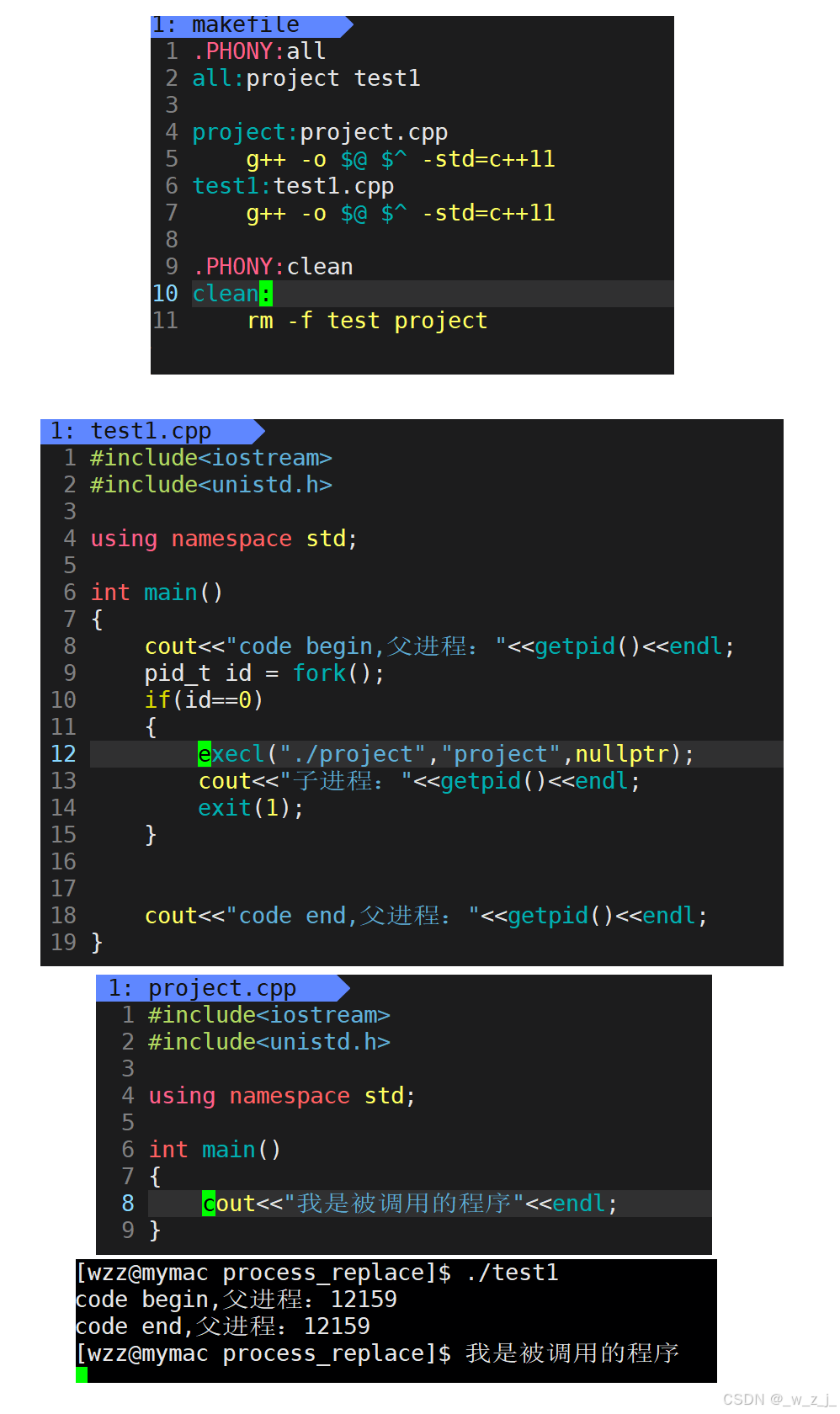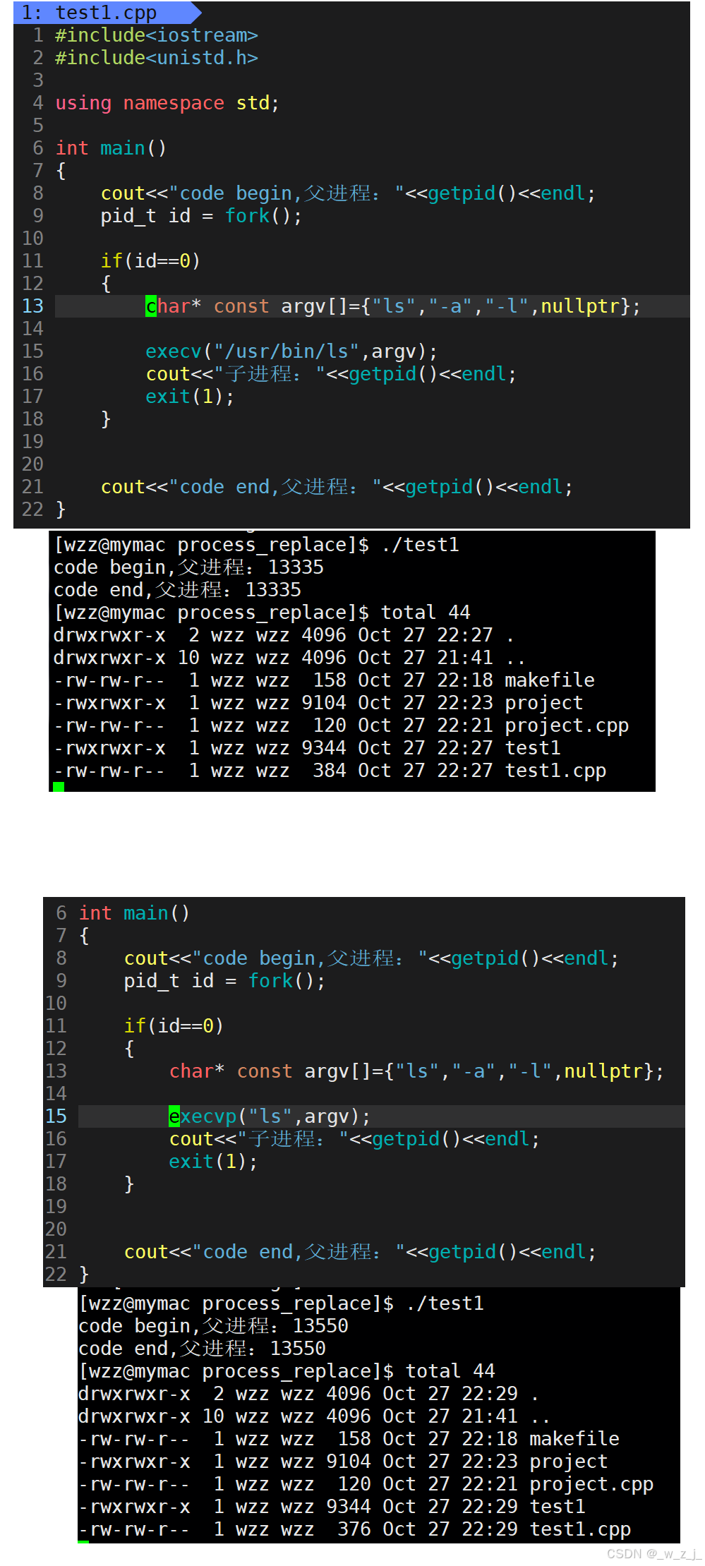 可以看到在子进程内进行程序替换,并不会影响父进程的运行。因为进程间的独立性,子进程发生覆盖时,进行写时拷贝。