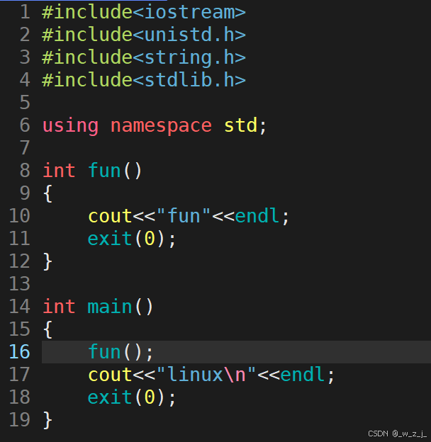 但其实,exit()会引起当前进程的终止,如果不在main函数中写,而是在其中的任意一个函数写就会终止,不再执行下面的程序: