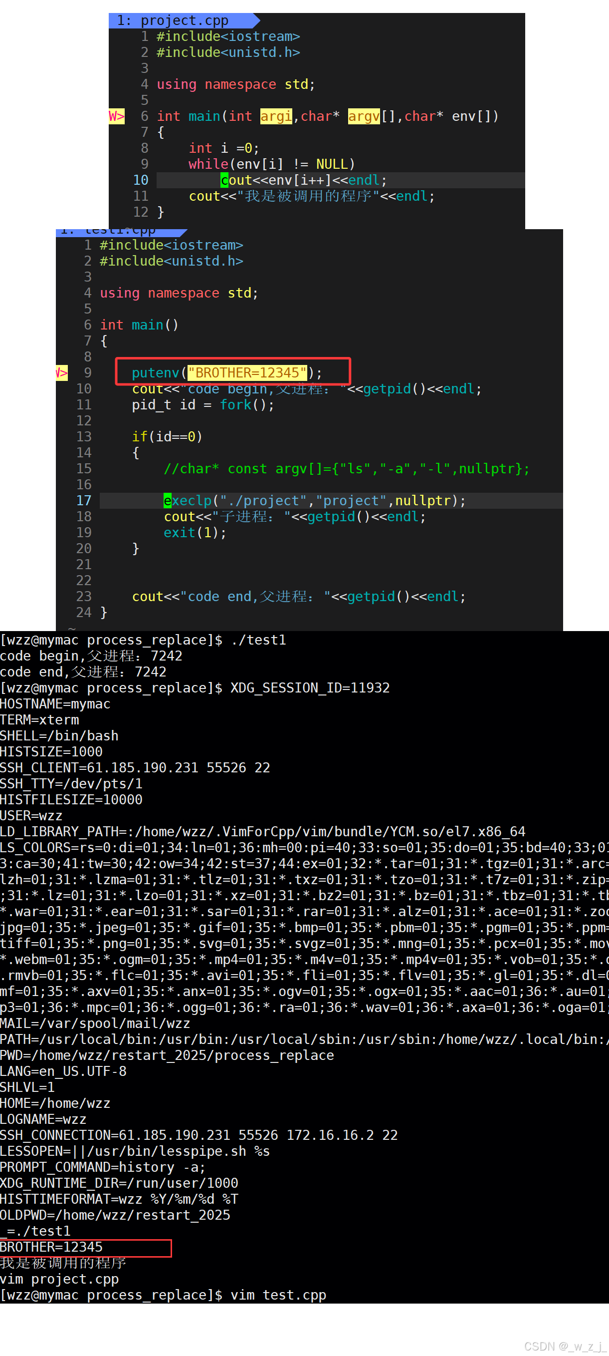 可以看到,project成功打印了父进程的环境变量,在这里我们使用了putenv函数为替换进程添加了一个环境变量BROTHER,这个环境变量在父进程中是没有的。为什么替换的程序会有父进程的环境变量呢?因为之前说过,进程的命令行参数与环境变量是存在用户虚拟空间中的: