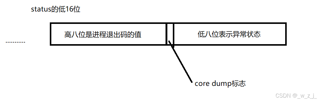 子进程退出1,返回的是256,其实就是2的8次方,就是status的第9个位置为1,子进程的退出码给到了status对应的位置。退出码、异常信号对应的值是多少,就填到上面图中对应的位置。