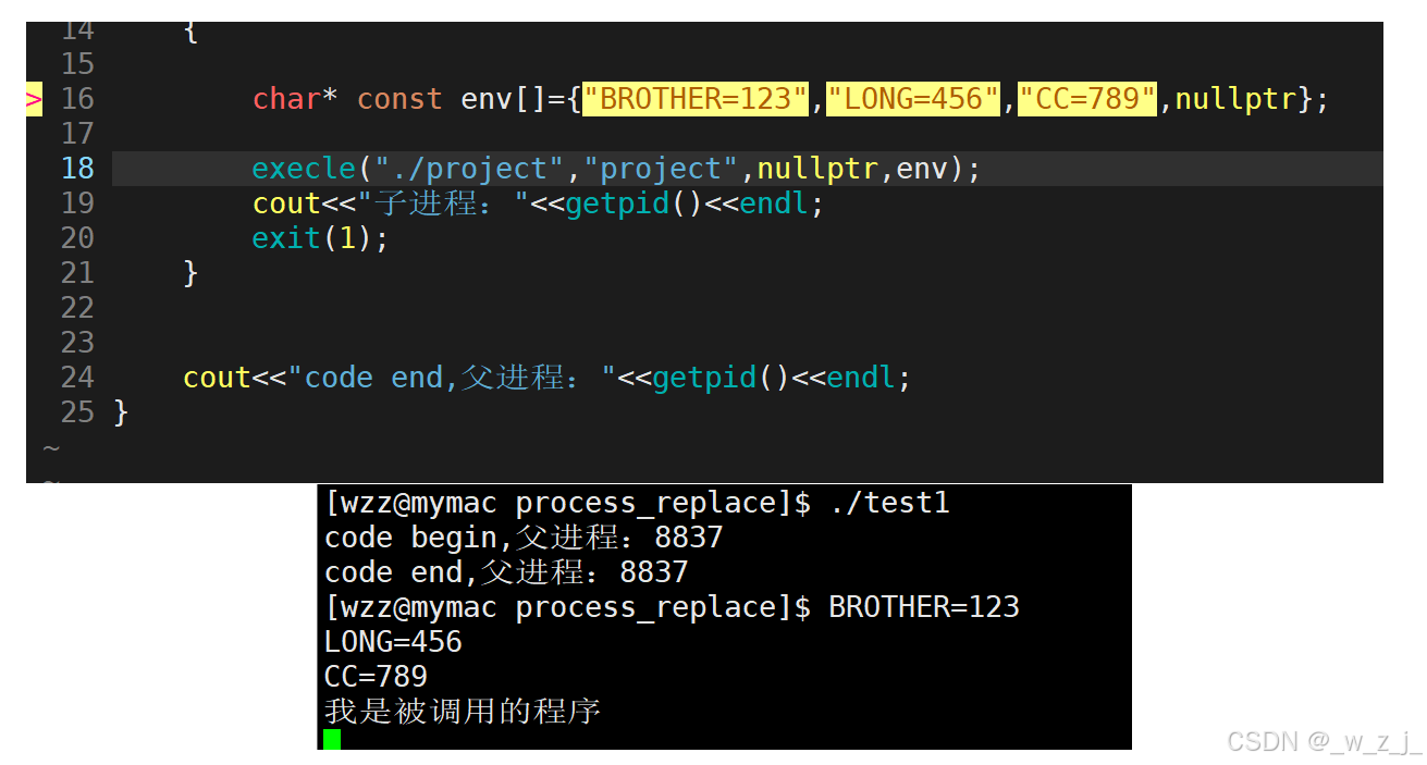 该函数可以为替换程序传递,在讲这个函数之前,我们首先要清楚,即使我们不使用这个函数为替换程序传递环境变量,它自己也会继承父进程的环境变量: