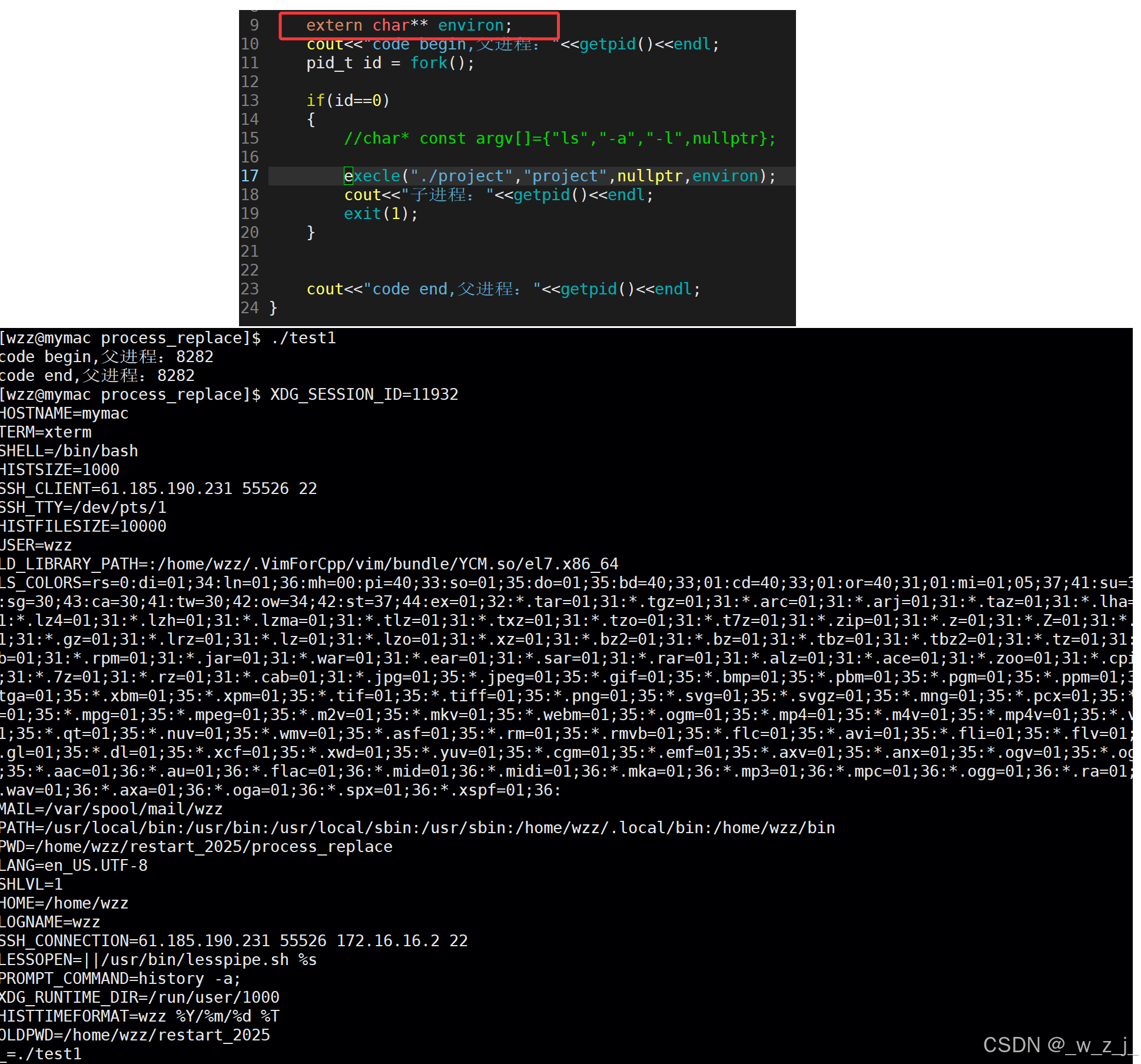 如果非要为替换进程传递环境变量呢?可以使用execle函数和environ变量。environ是一个全局变量指针,在所有使用 C/C++ 的进程中都存在。它保存了当前进程的 环境变量表。