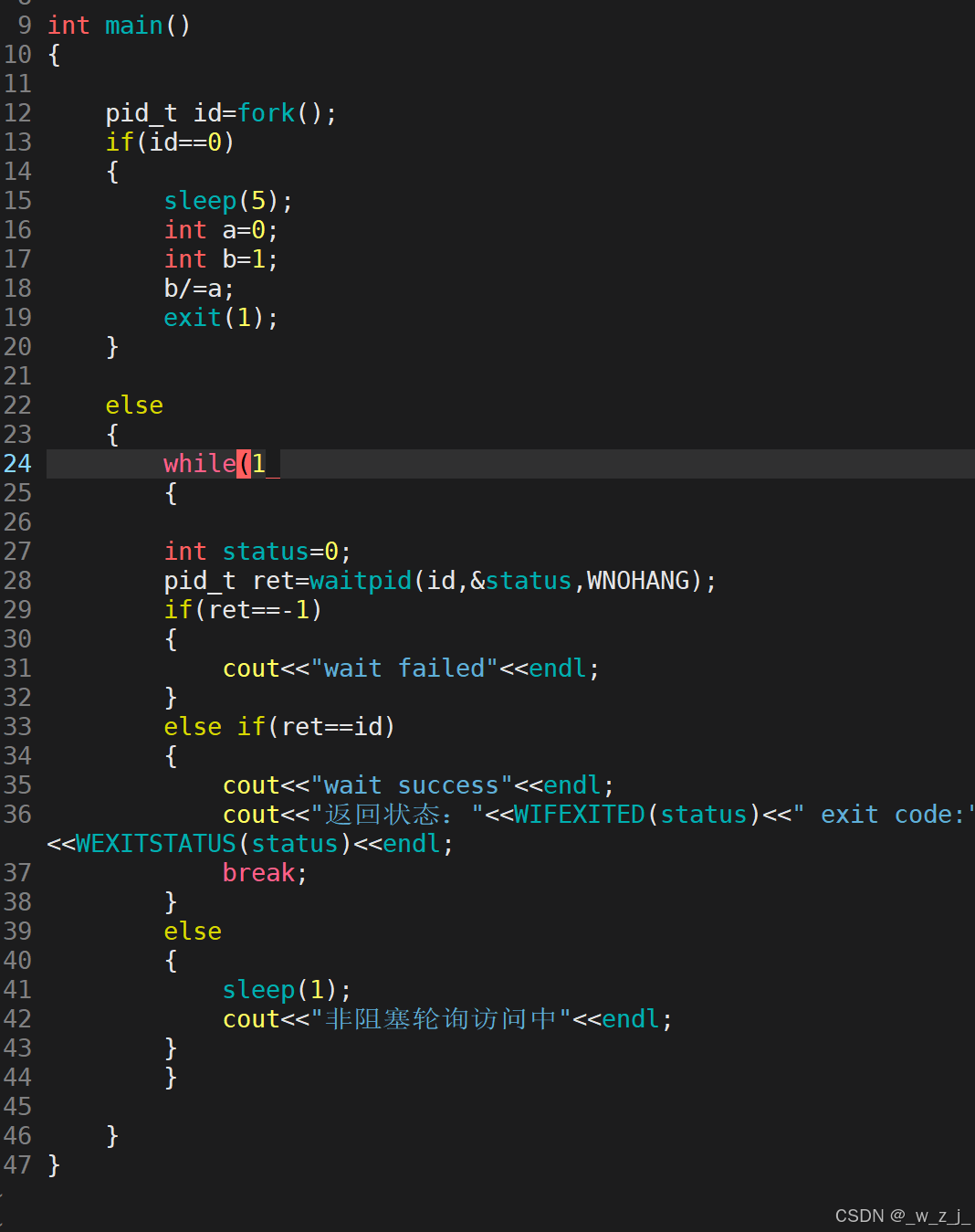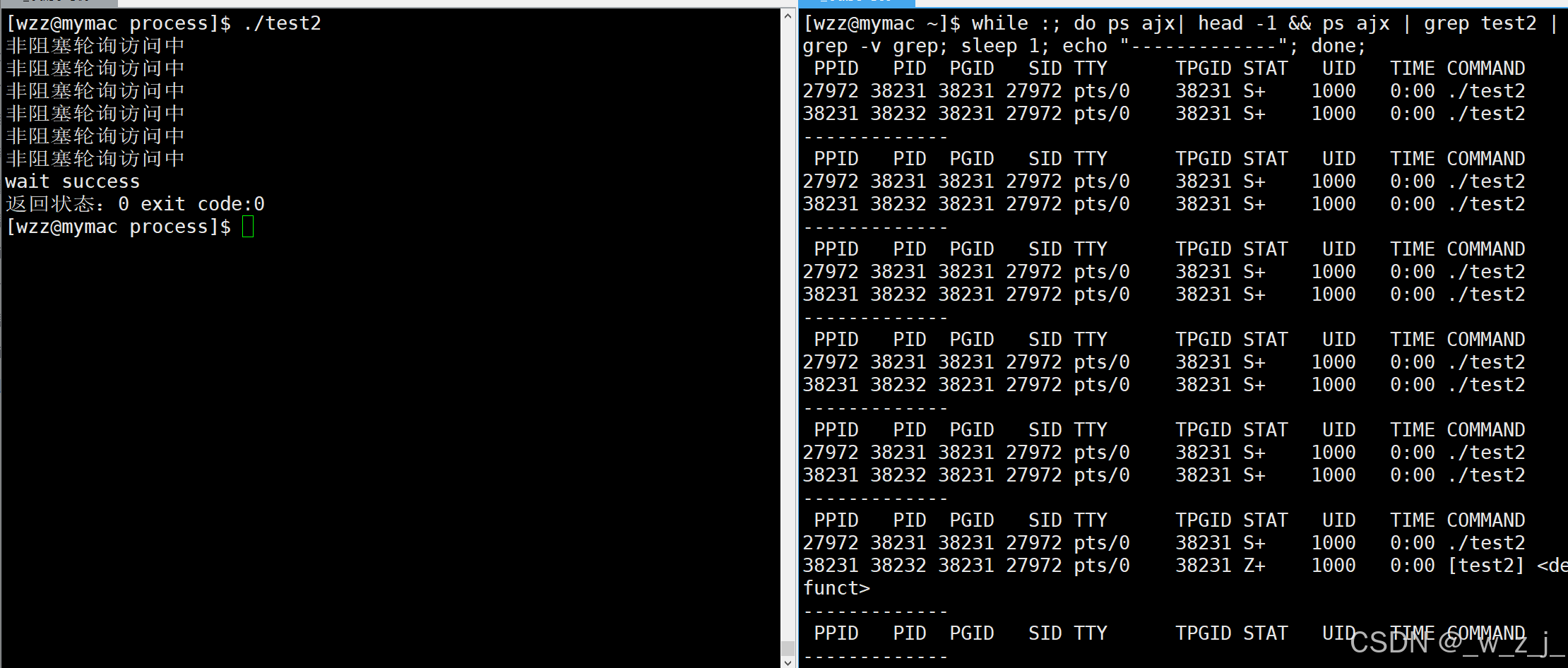 如果我们希望用非阻塞的方式等待子进程呢?可以用到非阻塞轮询访问:不等待结果、主动反复检查状态 的一种工作方式。可以用循环+WNOHANG来实现: