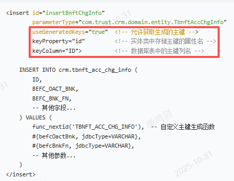 <insert id="insertBnftChgInfo" parameterType="com.entity.TbnftAccChgInfo" useGeneratedKeys="true" keyProperty="id" keyColumn="ID">INSERT INTO table001(ID,BEFC_OACT_BNK,BEFC_BNK_FN,BEFC_BNK_ACC_NAME,......省略字段APPL_DATE,MEMO) VALUES (#{id},#{befcOactBnk, jdbcType=VARCHAR},#{befcBnkFn, jdbcType=VARCHAR},#{befcBnkAccName, jdbcType=VARCHAR},......省略字段 #{applDate, jdbcType=INTEGER},#{memo, jdbcType=VARCHAR})