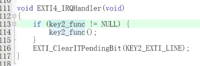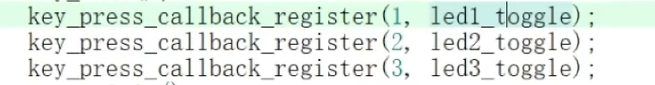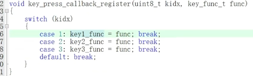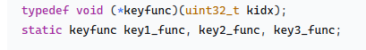 定义了一个函数指针类型keyfunc,然后声明了三个该类型的静态全局函数指针变量(keyl_func_t、key2_func_t和key3_func_t)。