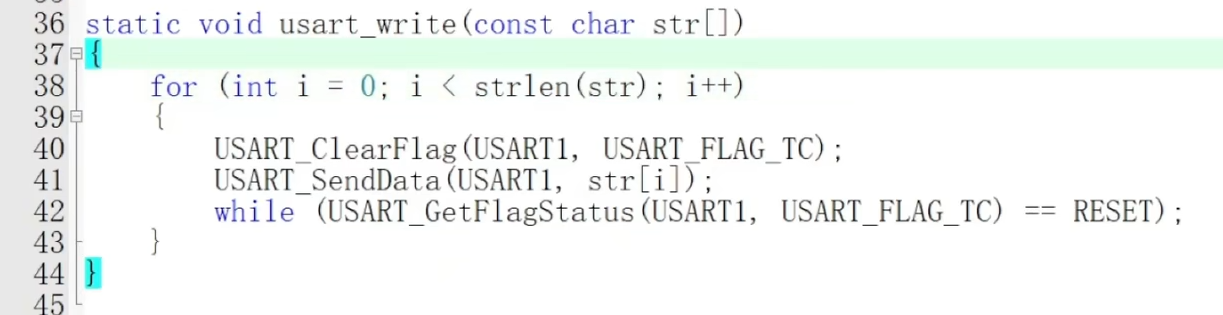 * 函数将你要发送的字符(str[i])写入到USART1的发送数据寄存器(TDR)。