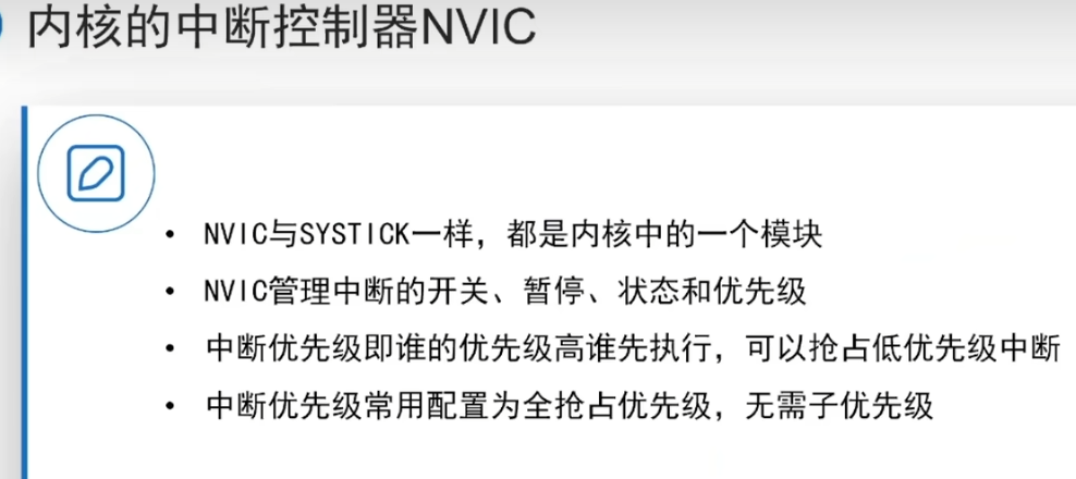 NVIC为嵌套向量中断控制器,用于设置中断的优先级,因为会存在很多中断,如外部\事件中断(EXTI)、串口中断(UART)和定时器中断。
