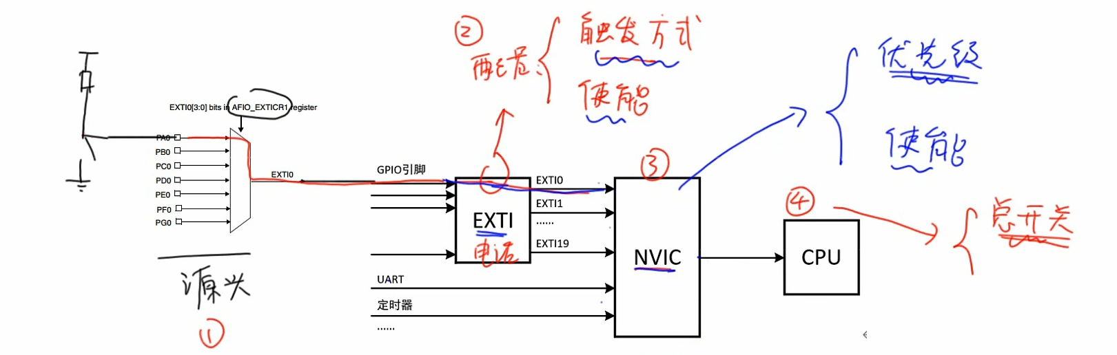 EXTI为外部\事件中断控制器,可以连接GPIO引脚;