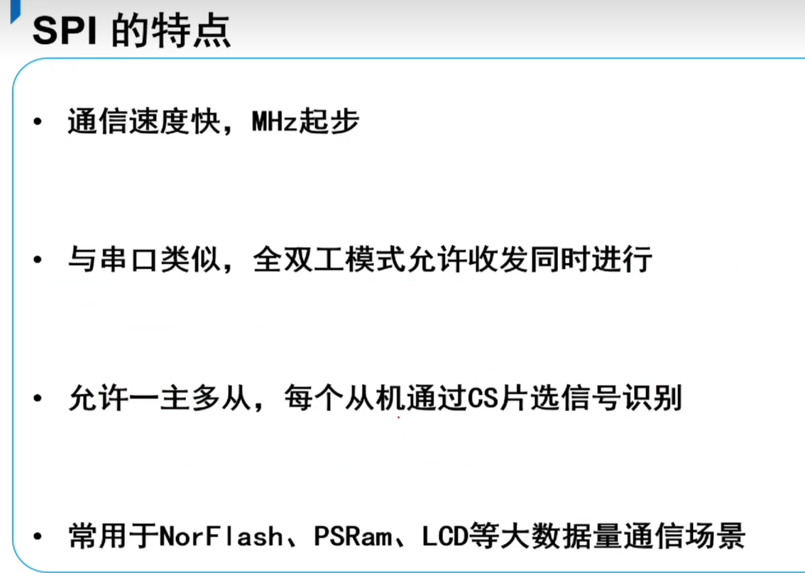 | 寻址方式 | 软件地址 (从站地址) | 无地址 | 硬件地址 (7位/10位地址) | 硬件片选 (通过CS引脚选择从设备) |