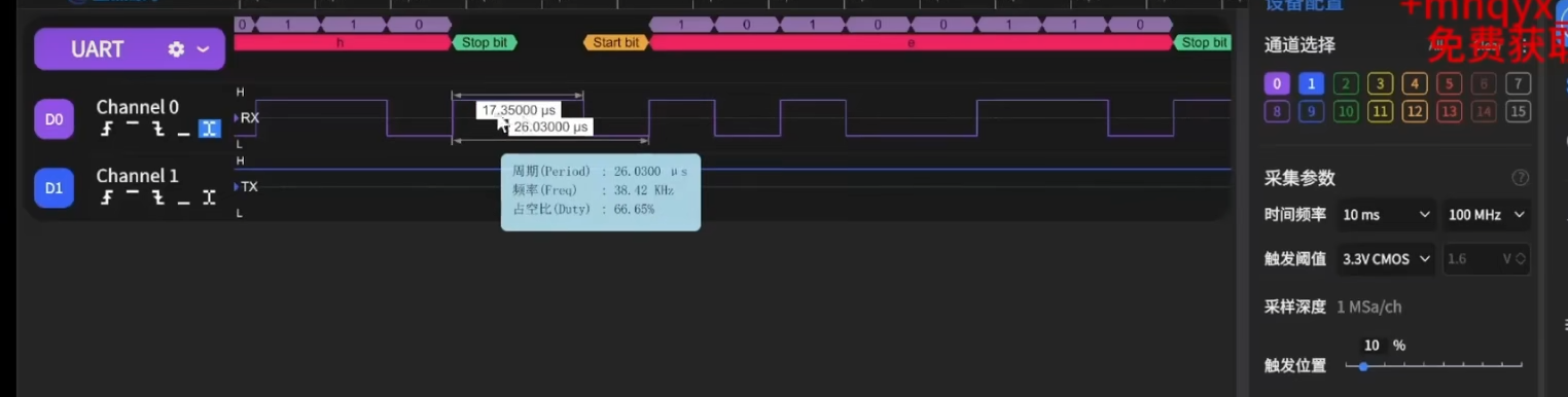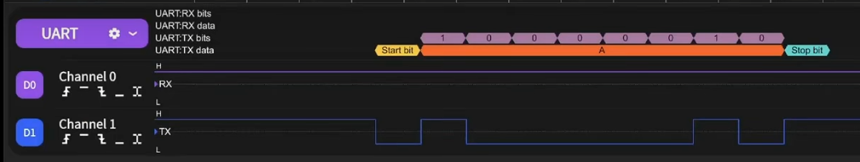 channel1(TX)为电脑向单片机的串口发送数据,channl0(RX)为单片机接收电脑端发送的数据。这里向单片机发送字符“A”,其ASCII码为65,转换为二进制为1000 0001。