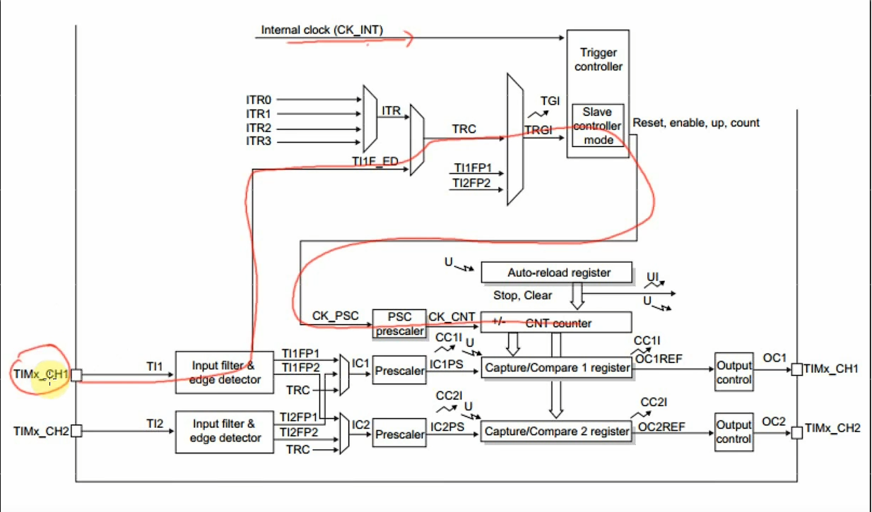 通用定时器除了可以接受来自系统的时钟,还可以接收来自外部时钟TIMx_CH1,当接收来自外部时钟TIMx_CH1时,可以捕获引脚的波形。