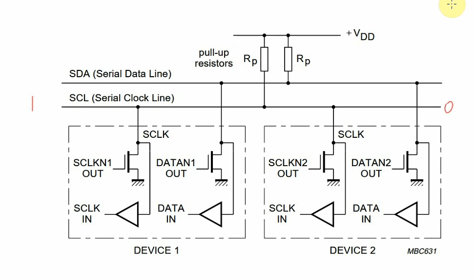上面是I2C协议的硬件实现,对应的是GPIO口的开漏输出,即P-MOS断开只有N-MOS可以使用,设备1和设备2均可以使SCL为高电平或低电平。