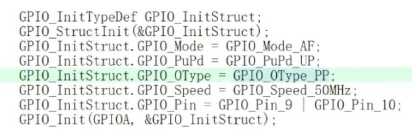 | GPIO_OType | GPIO_OType_PP | 推挽输出,可输出高电平和低电平,驱动能力强 |