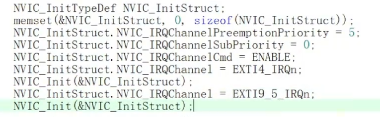 6.使用NVIC_Init()配置映射到EXTI线路的NVIC中断请求通道: