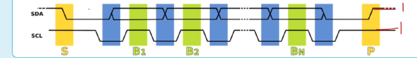 停止条件 (P):当 SCL为高电平 时,SDA发生一个从低到高 的电平跳变。这个状态表示一次传输的结束。