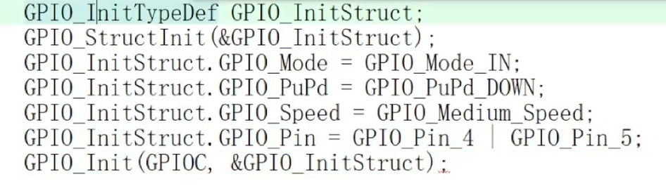 GPIO_InitTypeDef是库中定义的结构体类型,包含GPIO的所有可配置项。
