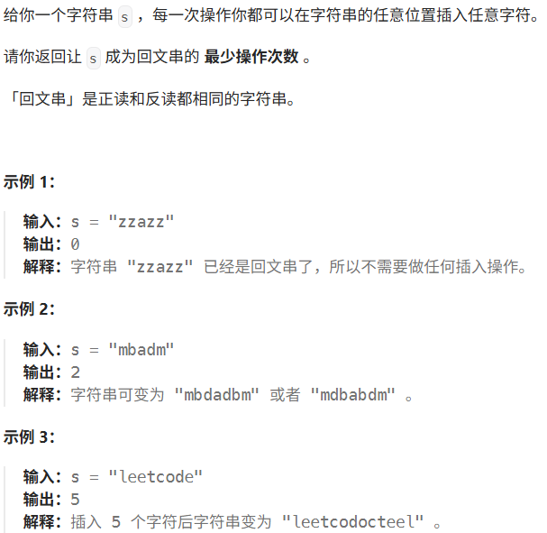 class Solution {public int minInsertions(String s) {int n = s.length();int[][] dp = new int[n][n];for (int i = n - 2; i >= 0; i--) {for (int j = i + 1; j < n; j++) {dp[i][j] = s.charAt(i) == s.charAt(j) ? dp[i + 1][j - 1] : 1 + Math.min(dp[i + 1][j], dp[i][j - 1]);}}return dp[0][n - 1];}
