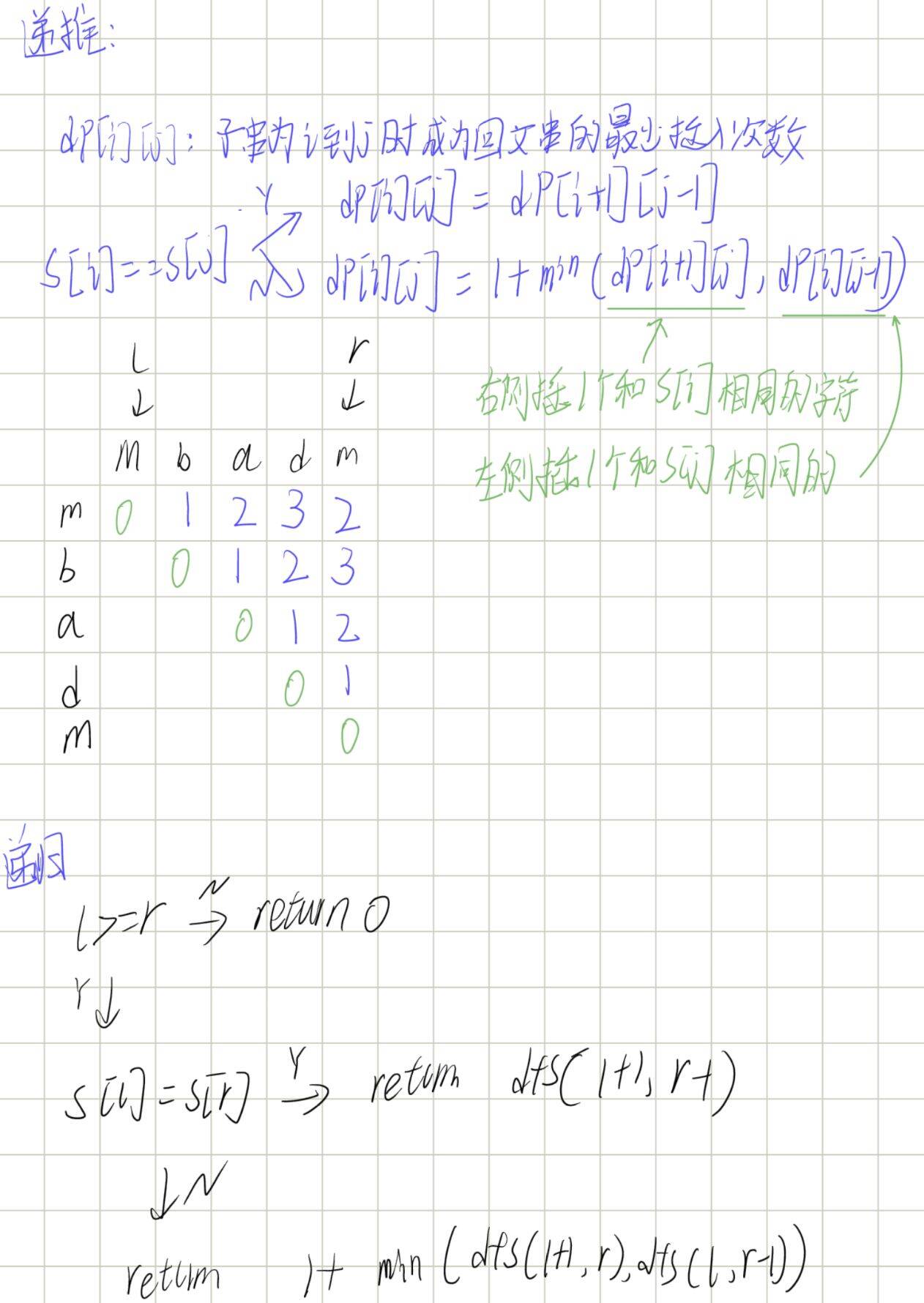 class Solution {private int[][] memory;private int minInsertions(String s, int left, int right) {//1.当字符串长度不超过1时不需要操作就已经是回文的了if (left >= right) {return 0;}//2.当记忆数组当中已经存储了这个值时,直接返回if (memory[left][right] != -1) {return memory[left][right];}//3。字符串长度超过1时//3.1字符串前后两个字符相等,不需要进行操作if (s.charAt(left) == s.charAt(right)) {return memory[left][right] = minInsertions(s, left + 1, right - 1);}//3.2字符串前后两个字符不相等,人为操作左或者右添加一个相等字符的操作数是1return memory[left][right] = 1 + Math.min(minInsertions(s, left + 1, right), minInsertions(s, left, right - 1));}public int minInsertions(String s) {memory = new int[s.length()][s.length()];for (int[] ints : memory) {Arrays.fill(ints, -1);}return minInsertions(s, 0, s.length() - 1);}