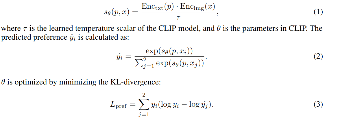 训练集中的每个实例包含一对图像 {x, x} 和一个提示 p,如果图像 x 优于 x,则提示 p 的标签为 y = [1, 0],否则为 y = [0, 1]。CLIP 模型可以看作是一个评分函数 s,用于计算提示 p 和图像 x 之间的相似度: