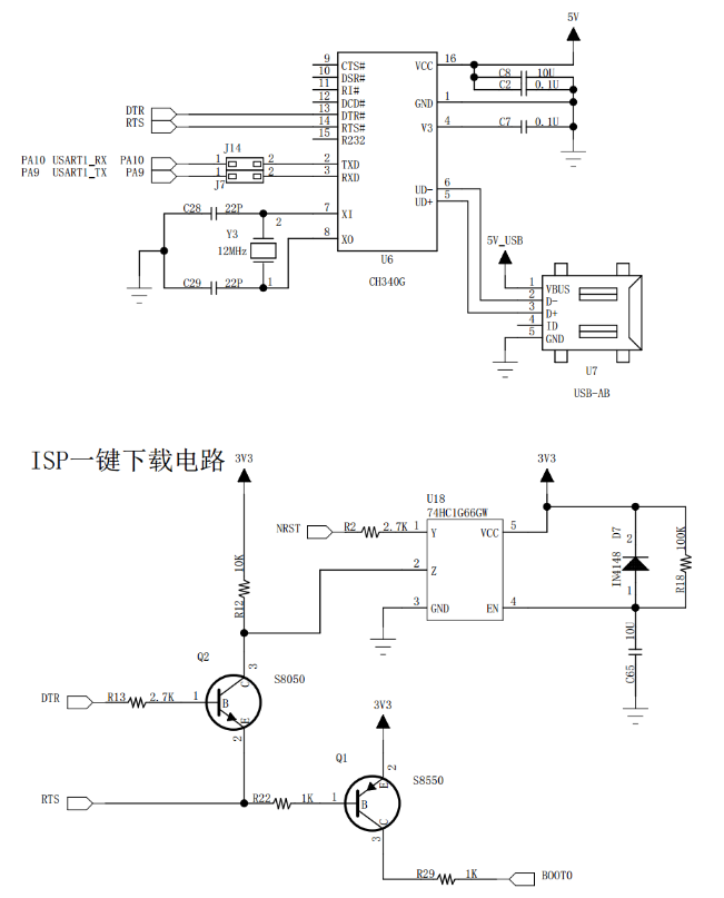 以上步骤有个不好的地方就是下载程序需要跳线及复位操作,很繁琐。通过对ISP的原理认识,一键ISP就诞生了,它需要做的事情就是用上位机去控制BOOT0脚和单片机的复位脚,原理图: