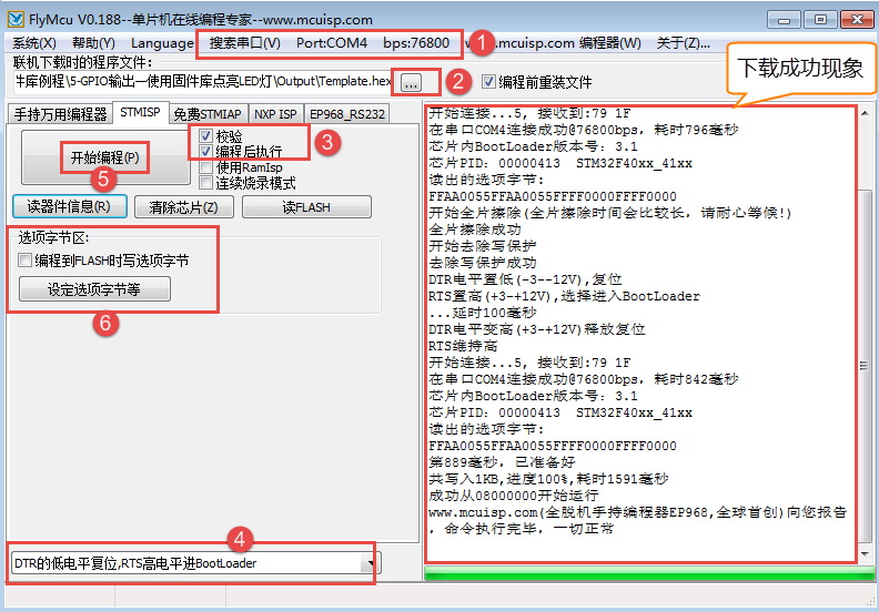 打开FlyMcu软件,具体配置见图 下载配置和下载成功现象 :①搜索串口,设置波特率为76800(不要超过115200)、 ②选择要下载的HEX文件、③校验、编程后执行、④DTR低电平复位,RTS高电平进入bootloader(上位机软件为232逻辑电平标准)、⑤开始编程、⑥选项字节的勾去掉,如果勾选上则下载程序后不能自动运行。 如果出现一直连接的情况,按一下开发板的复位键即可。 下载成功后的现象具体见图 下载配置和下载成功现象 中的下载成功现象指示的方框部分。
