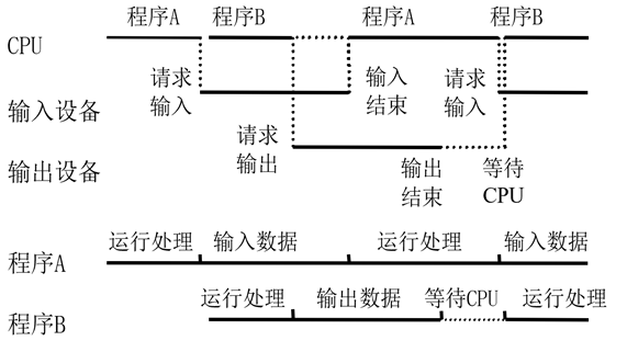 3、批处理操作系统:解决人机矛盾及 CPU 和 I/O 设备之间速度不匹配的矛盾。单道批处理系统引用脱机输入输出技术,由监督程序负责控制输入输出,其特征为自动性、顺序性、单道性。多道批处理系统多个存储在主存中的程序在管理程序的控制下交替运行,共享CPU和系统中的其他资源,并发、资源利用率提升,其特征为多道、宏观上并行、微观上串行。多通道如下图: